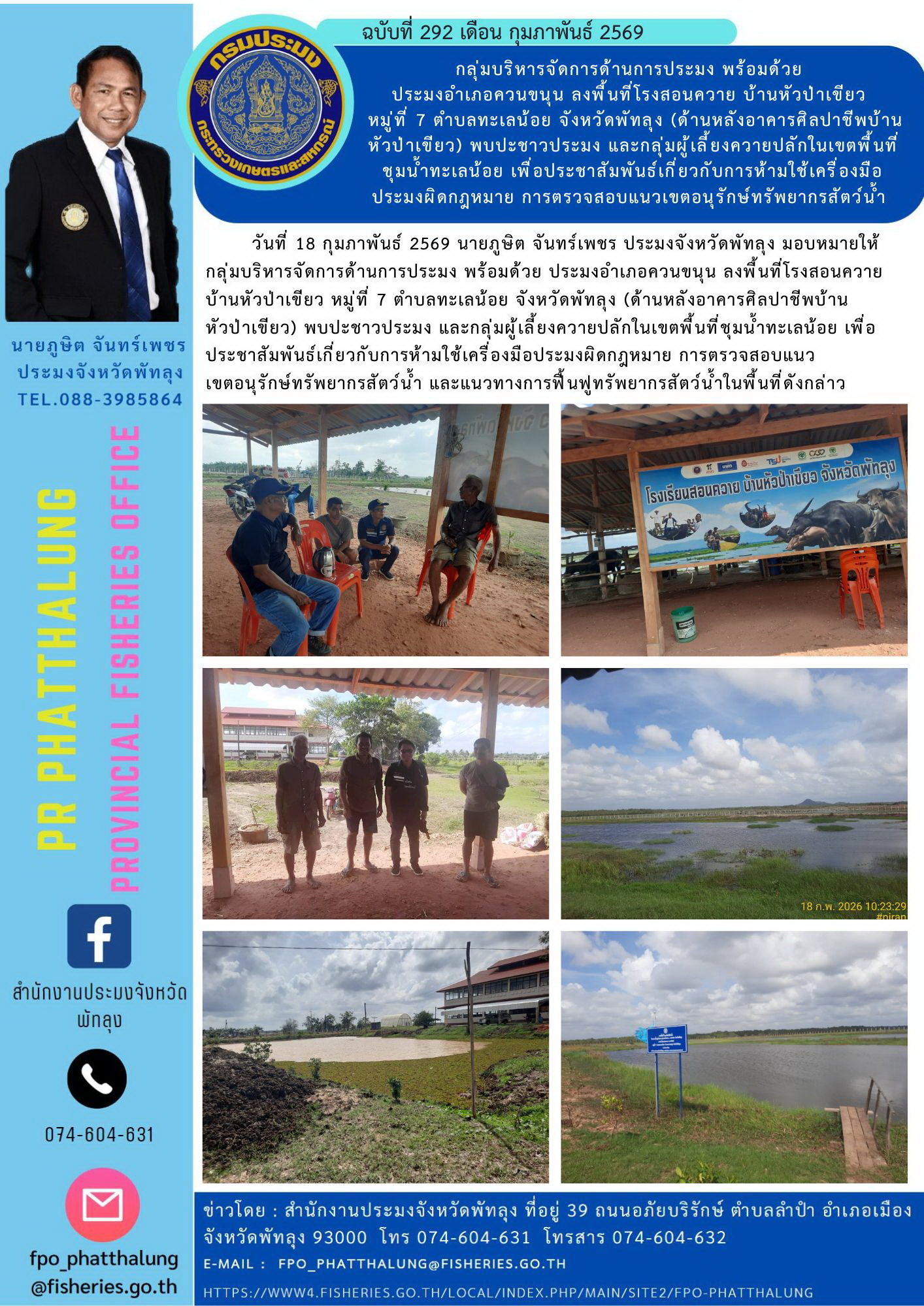 วันที่ 18 กุมภาพันธ์ 2569 นายภูษิต จันทร์เพชร ประมงจังหวัดพัทลุง มอบหมายให้กลุ่มบริหารจัดการด้านการประมง พร้อมด้วย ประมงอำเภอควนขนุน ลงพื้นที่โรงสอนควาย บ้านหัวป่าเขียว หมู่ที่ 7 ตำบลทะเลน้อย จังหวัดพัทลุง (ด้านหลังอาคารศิลปาชีพบ้านหัวป่าเขียว) พบปะชาวประมง และกลุ่มผู้เลี้ยงควายปลักในเขตพื้นที่ชุมน้ำทะเลน้อย เพื่อประชาสัมพันธ์เกี่ยวกับการห้ามใช้เครื่องมือประมงผิดกฎหมาย การตรวจสอบแนวเขตอนุรักษ์ทรัพยากรสัตว์น้ำ และแนวทางการฟื้นฟูทรัพยากรสัตว์น้ำในพื้นที่ดังกล่าว