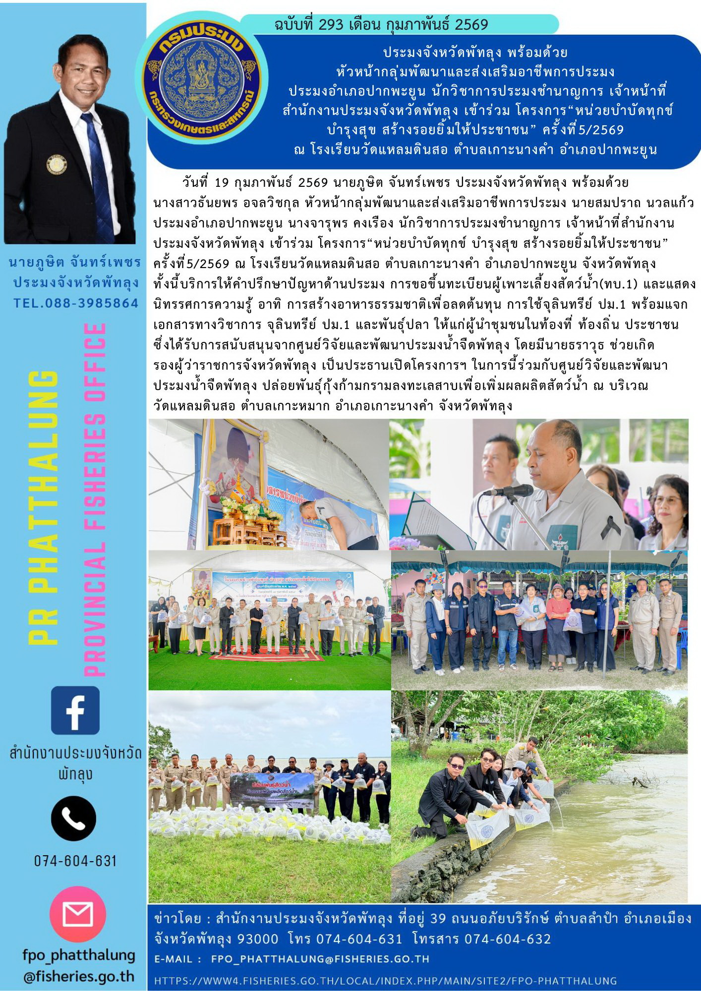 วันที่ 19 กุมภาพันธ์ 2569 นายภูษิต จันทร์เพชร ประมงจังหวัดพัทลุง พร้อมด้วย นางสาวธันยพร อจลวิชกุล หัวหน้ากลุ่มพัฒนาและส่งเสริมอาชีพการประมง นายสมปราถ นวลแก้ว ประมงอำเภอปากพะยูน นางจารุพร คงเรือง นักวิชาการประมงชำนาญการ เจ้าหน้าที่สำนักงานประมงจังหวัดพัทลุง เข้าร่วม โครงการ“หน่วยบำบัดทุกข์ บำรุงสุข สร้างรอยยิ้มให้ประชาชน” ครั้งที่5/2569 ณ โรงเรียนวัดแหลมดินสอ ตำบลเกาะนางคำ อำเภอปากพะยูน จังหวัดพัทลุง ทั้งนี้บริการให้คำปรึกษาปัญหาด้านประมง การขอขึ้นทะเบียนผู้เพาะเลี้ยงสัตว์น้ำ(ทบ.1) และแสดงนิทรรศการความรู้ อาทิ การสร้างอาหารธรรมชาติเพื่อลดต้นทุน การใช้จุลินทรีย์ ปม.1 พร้อมแจกเอกสารทางวิชาการ จุลินทรีย์ ปม.1 และพันธุ์ปลา ให้แก่ผู้นำชุมชนในท้องที่ ท้องถิ่น ประชาชน ซึ่งได้รับการสนับสนุนจากศูนย์วิจัยและพัฒนาประมงน้ำจืดพัทลุง โดยมีนายธราวุธ ช่วยเกิด รองผู้ว่าราชการจังหวัดพัทลุง เป็นประธานเปิดโครงการฯ ในการนี้ร่วมกับศูนย์วิจัยและพัฒนาประมงน้ำจืดพัทลุง ปล่อยพันธุ์กุ้งก้ามกรามลงทะเลสาบเพื่อเพิ่มผลผลิตสัตว์น้ำ ณ บริเวณวัดแหลมดินสอ ตำบลเกาะหมาก อำเภอเกาะนางคำ จังหวัดพัทลุง