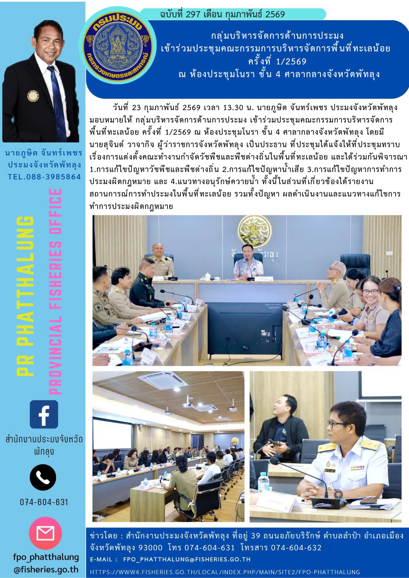 วันที่ 23 กุมภาพันธ์ 2569 เวลา 13.30 น. นายภูษิต จันทร์เพชร ประมงจังหวัดพัทลุง มอบหมายให้ กลุ่มบริหารจัดการด้านการประมง เข้าร่วมประชุมคณะกรรมการบริหารจัดการพื้นที่ทะเลน้อย ครั้งที่ 1/2569 ณ ห้องประชุมโนรา ชั้น 4 ศาลากลางจังหวัดพัทลุง โดยมี นายสุจินต์ วาจากิจ ผู้ว่าราชการจังหวัดพัทลุง เป็นประธาน ที่ประชุมได้แจ้งให้ที่ประชุมทราบเรื่องการแต่งตั้งคณะทำงานกำจัดวัชพืชและพืชต่างถิ่นในพื้นที่ทะเลน้อย และได้ร่วมกันพิจารณา 1.การแก้ไขปัญหาวัชพืชและพืชต่างถิ่น 2.การแก้ไขปัญหาน้ำเสีย 3.การแก้ไขปัญหาการทำการประมงผิดกฎหมาย และ 4.แนวทางอนุรักษ์ควายน้ำ ทั้งนี้ในส่วนที่เกี่ยวข้องได้รายงานสถานการณ์การทำประมงในพื้นที่ทะเลน้อย รวมทั้งปัญหา ผลดำเนินงานและแนวทางแก้ไขการทำการประมงผิดกฎหมาย