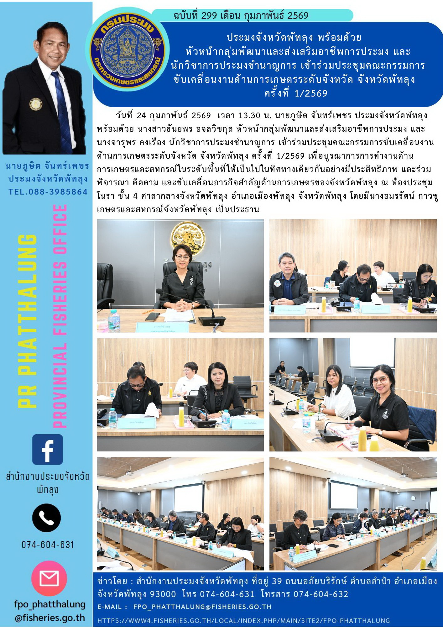 ประมงจังหวัดพัทลุง พร้อมด้วย หัวหน้ากลุ่มพัฒนาและส่งเสริมอาชีพการประมง และ นักวิชาการประมงชำนาญการ เข้าร่วมประชุมคณะกรรมการ ขับเคลื่อนงานด้านการเกษตรระดับจังหวัด จังหวัดพัทลุง ครั้งที่ 1/2569