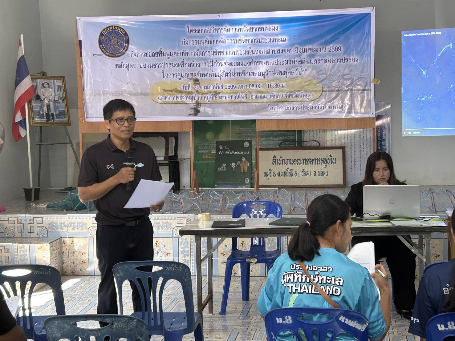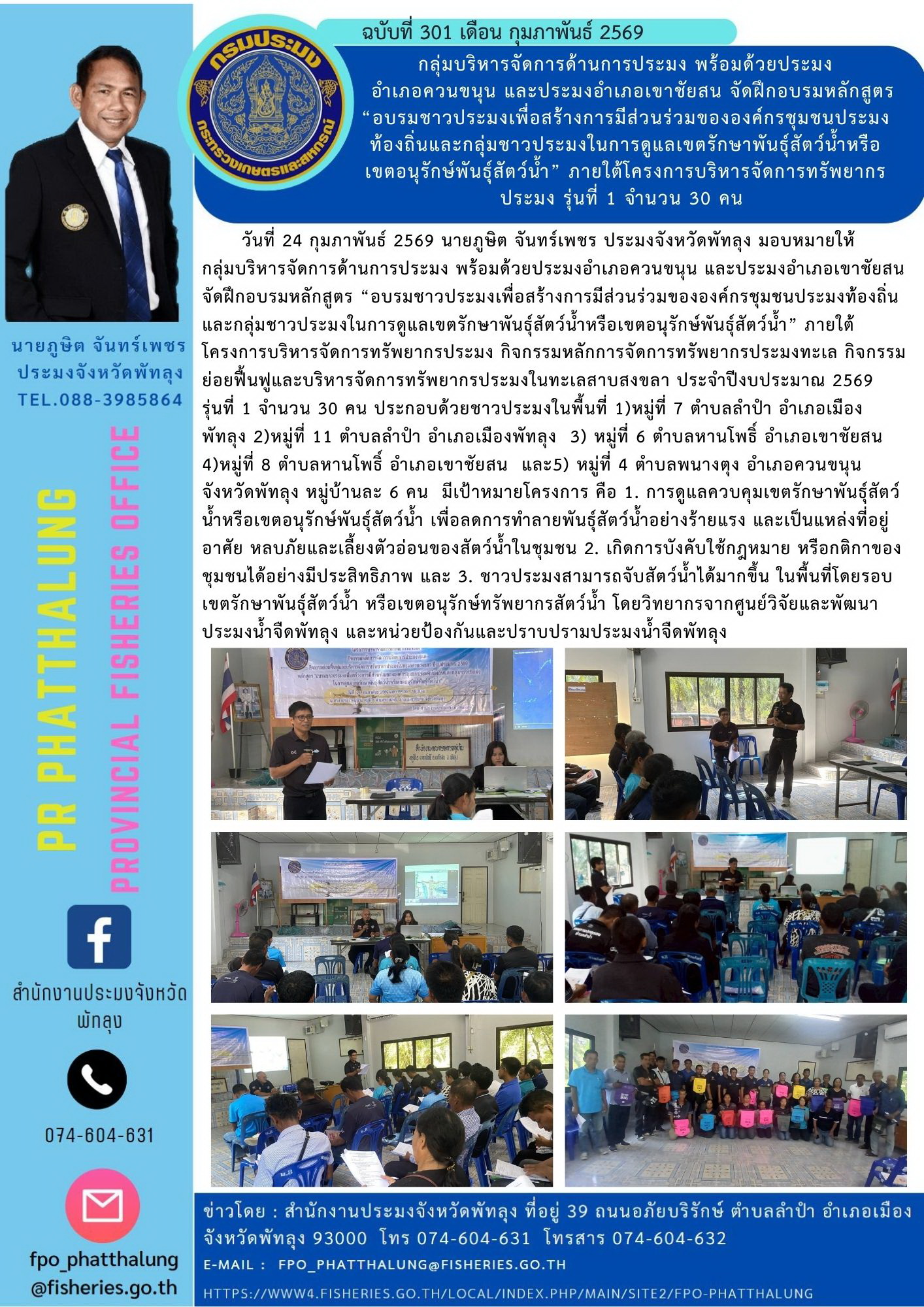 วันที่ 24 กุมภาพันธ์ 2569 นายภูษิต จันทร์เพชร ประมงจังหวัดพัทลุง มอบหมายให้ กลุ่มบริหารจัดการด้านการประมง พร้อมด้วยประมงอำเภอควนขนุน และประมงอำเภอเขาชัยสน จัดฝึกอบรมหลักสูตร “อบรมชาวประมงเพื่อสร้างการมีส่วนร่วมขององค์กรชุมชนประมงท้องถิ่นและกลุ่มชาวประมงในการดูแลเขตรักษาพันธุ์สัตว์น้ำหรือเขตอนุรักษ์พันธุ์สัตว์น้ำ” ภายใต้โครงการบริหารจัดการทรัพยากรประมง กิจกรรมหลักการจัดการทรัพยากรประมงทะเล กิจกรรมย่อยฟื้นฟูและบริหารจัดการทรัพยากรประมงในทะเลสาบสงขลา ประจำปีงบประมาณ 2569 รุ่นที่ 1 จำนวน 30 คน ประกอบด้วยชาวประมงในพื้นที่ 1)หมู่ที่ 7 ตำบลลำปำ อำเภอเมืองพัทลุง 2)หมู่ที่ 11 ตำบลลำปำ อำเภอเมืองพัทลุง 3) หมู่ที่ 6 ตำบลหานโพธิ์ อำเภอเขาชัยสน 4)หมู่ที่ 8 ตำบลหานโพธิ์ อำเภอเขาชัยสน และ5) หมู่ที่ 4 ตำบลพนางตุง อำเภอควนขนุน จังหวัดพัทลุง หมู่บ้านละ 6 คน มีเป้าหมายโครงการ คือ 1. การดูแลควบคุมเขตรักษาพันธุ์สัตว์น้ำหรือเขตอนุรักษ์พันธุ์สัตว์น้ำ เพื่อลดการทำลายพันธุ์สัตว์น้ำอย่างร้ายแรง และเป็นแหล่งที่อยู่อาศัย หลบภัยและเลี้ยงตัวอ่อนของสัตว์น้ำในชุมชน 2. เกิดการบังคับใช้กฎหมาย หรือกติกาของชุมชนได้อย่างมีประสิทธิภาพ และ 3. ชาวประมงสามารถจับสัตว์น้ำได้มากขึ้น ในพื้นที่โดยรอบเขตรักษาพันธุ์สัตว์น้ำ หรือเขตอนุรักษ์ทรัพยากรสัตว์น้ำ โดยวิทยากรจากศูนย์วิจัยและพัฒนาประมงน้ำจืดพัทลุง และหน่วยป้องกันและปราบปรามประมงน้ำจืดพัทลุง