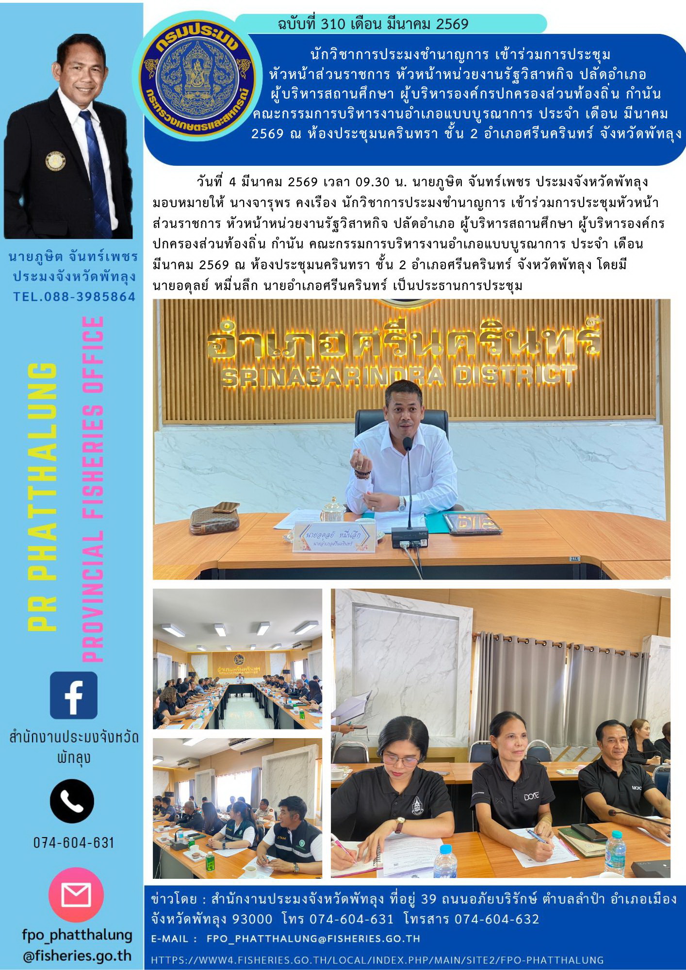 วันที่ 4 มีนาคม 2569 เวลา 09.30 น. นายภูษิต จันทร์เพชร ประมงจังหวัดพัทลุง มอบหมายให้ นางจารุพร คงเรือง นักวิชาการประมงชำนาญการ เข้าร่วมการประชุมหัวหน้าส่วนราชการ หัวหน้าหน่วยงานรัฐวิสาหกิจ ปลัดอำเภอ ผู้บริหารสถานศึกษา ผู้บริหารองค์กรปกครองส่วนท้องถิ่น กำนัน คณะกรรมการบริหารงานอำเภอแบบบูรณาการ ประจำ เดือน มีนาคม 2569 ณ ห้องประชุมนครินทรา ชั้น 2 อำเภอศรีนครินทร์ จังหวัดพัทลุง โดยมี นายอดุลย์ หมื่นลึก นายอำเภอศรีนครินทร์ เป็นประธานการประชุม