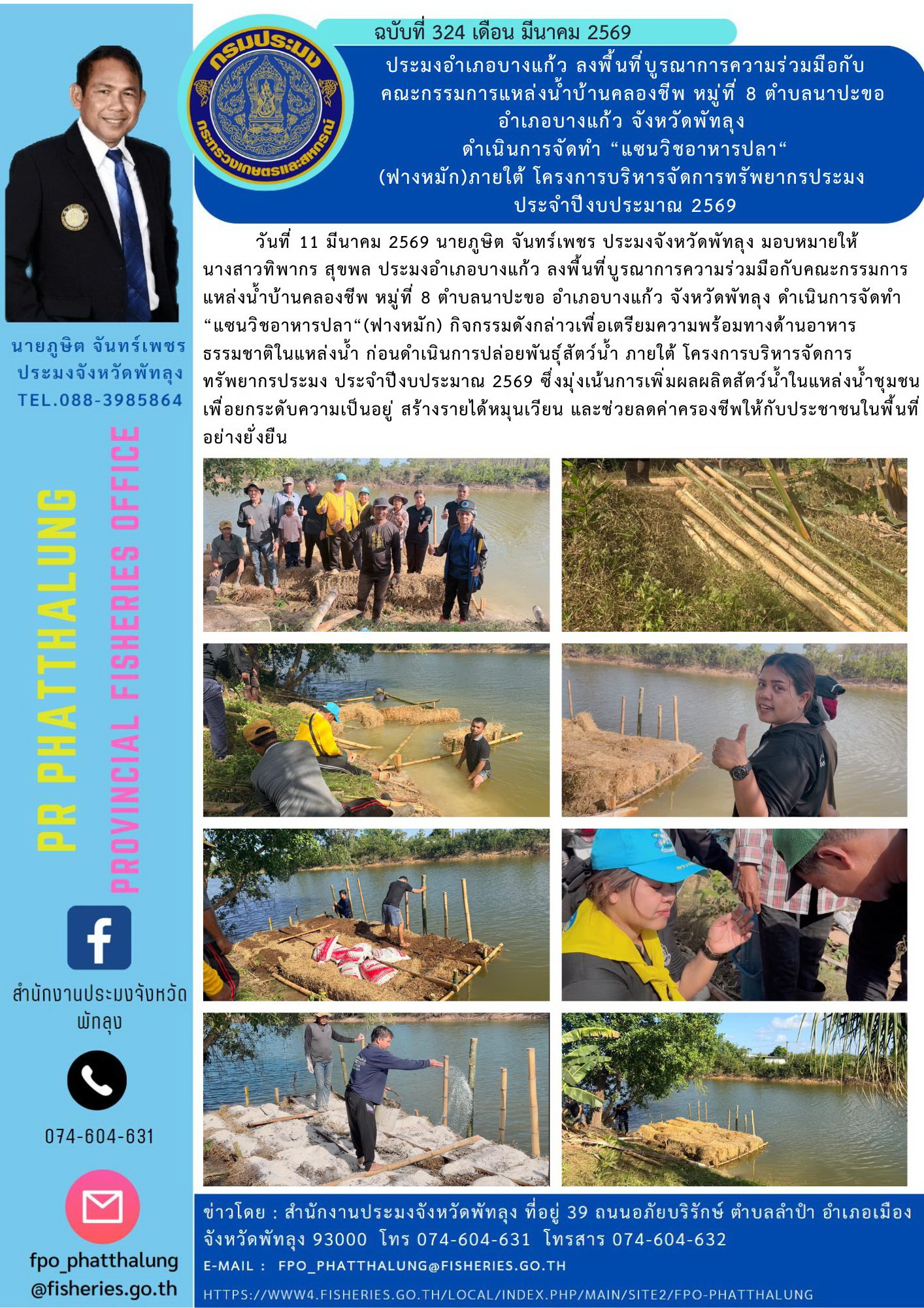 ประมงอำเภอบางแก้ว ลงพื้นที่บูรณาการความร่วมมือกับ คณะกรรมการแหล่งน้ำบ้านคลองชีพ หมู่ที่ 8 ตำบลนาปะขอ อำเภอบางแก้ว จังหวัดพัทลุง ดำเนินการจัดทำ “แซนวิชอาหารปลา“ (ฟางหมัก)ภายใต้ โครงการบริหารจัดการทรัพยากรประมง ประจำปีงบประมาณ 2569