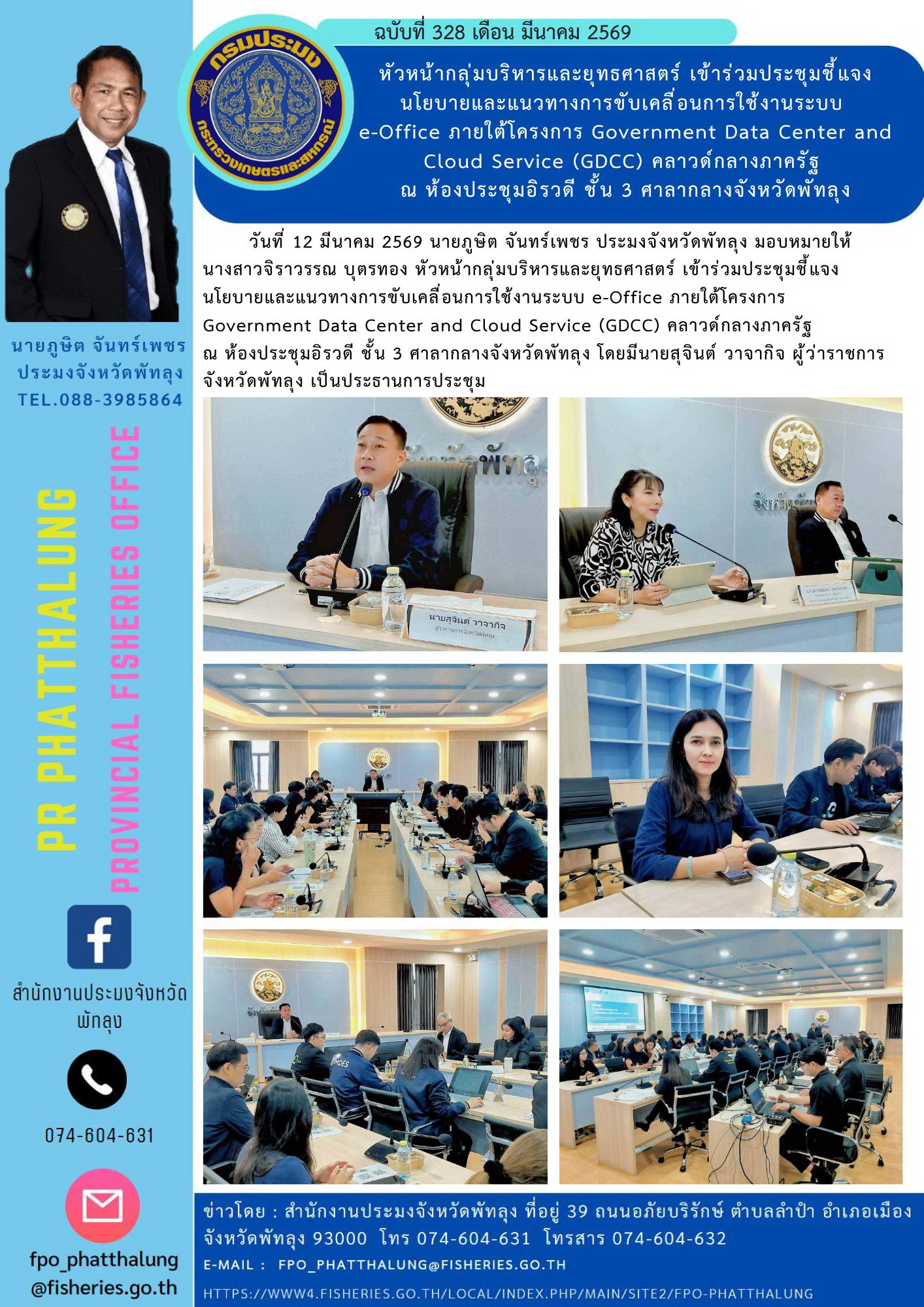 วันที่ 12 มีนาคม 2569 นายภูษิต จันทร์เพชร ประมงจังหวัดพัทลุง มอบหมายให้ นางสาวจิราวรรณ บุตรทอง หัวหน้ากลุ่มบริหารและยุทธศาสตร์ เข้าร่วมประชุมชี้แจงนโยบายและแนวทางการขับเคลื่อนการใช้งานระบบ e-Office ภายใต้โครงการGovernment Data Center and Cloud Service (GDCC) คลาวด์กลางภาครัฐ ณ ห้องประชุมอิรวดี ชั้น 3 ศาลากลางจังหวัดพัทลุง โดยมีนายสุจินต์ วาจากิจ ผู้ว่าราชการจังหวัดพัทลุง เป็นประธานการประชุม
