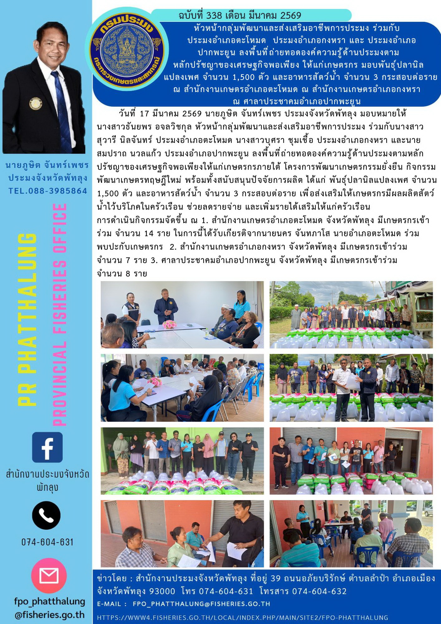 วันที่ 17 มีนาคม 2569 นายภูษิต จันทร์เพชร ประมงจังหวัดพัทลุง มอบหมายให้ นางสาวธันยพร อจลวิชกุล หัวหน้ากลุ่มพัฒนาและส่งเสริมอาชีพการประมง ร่วมกับนางสาวสุวารี นิลจันทร์ ประมงอำเภอตะโหมด นางสาวบุศรา ชุมเชื้อ ประมงอำเภอกงหรา และนายสมปราถ นวลแก้ว ประมงอำเภอปากพะยูน ลงพื้นที่ถ่ายทอดองค์ความรู้ด้านประมงตามหลักปรัชญาของเศรษฐกิจพอเพียงให้แก่เกษตรกรภายใต้ โครงการพัฒนาเกษตรกรรมยั่งยืน กิจกรรมพัฒนาเกษตรทฤษฎีใหม่ พร้อมทั้งสนับสนุนปัจจัยการผลิต ได้แก่ พันธุ์ปลานิลแปลงเพศ จำนวน 1,500 ตัว และอาหารสัตว์น้ำ จำนวน 3 กระสอบต่อราย เพื่อส่งเสริมให้เกษตรกรมีผลผลิตสัตว์น้ำไว้บริโภคในครัวเรือน ช่วยลดรายจ่าย และเพิ่มรายได้เสริมให้แก่ครัวเรือนการดำเนินกิจกรรมจัดขึ้น ณ 1. สำนักงานเกษตรอำเภอตะโหมด จังหวัดพัทลุง มีเกษตรกรเข้าร่วม จำนวน 14 ราย ในการนี้ได้รับเกียรติจากนายนคร จันทภาโส นายอำเภอตะโหมด ร่วมพบปะกับเกษตรกร 2. สำนักงานเกษตรอำเภอกงหรา จังหวัดพัทลุง มีเกษตรกรเข้าร่วม จำนวน 7 ราย 3. ศาลาประชาคมอำเภอปากพะยูน จังหวัดพัทลุง มีเกษตรกรเข้าร่วม จำนวน 8 ราย