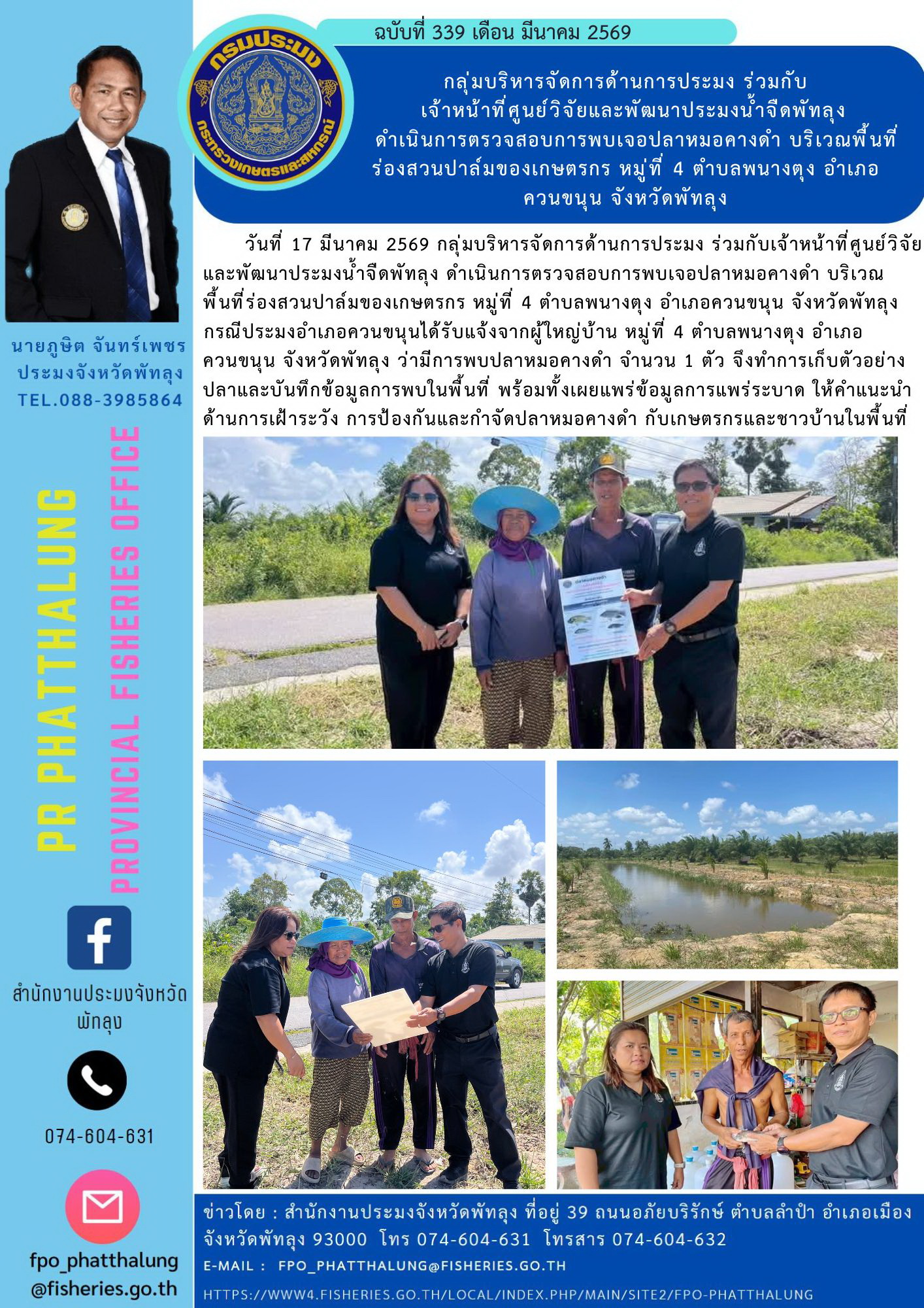 วันที่ 17 มีนาคม 2569 กลุ่มบริหารจัดการด้านการประมง ร่วมกับเจ้าหน้าที่ศูนย์วิจัย และพัฒนาประมงน้ำจืดพัทลุง ดำเนินการตรวจสอบการพบเจอปลาหมอคางดำ บริเวณพื้นที่ร่องสวนปาล์มของเกษตรกร หมู่ที่ 4 ตำบลพนางตุง อำเภอควนขนุน จังหวัดพัทลุง กรณีประมงอำเภอควนขนุนได้รับแจ้งจากผู้ใหญ่บ้าน หมู่ที่ 4 ตำบลพนางตุง อำเภอควนขนุน จังหวัดพัทลุง ว่ามีการพบปลาหมอคางดำ จำนวน 1 ตัว จึงทำการเก็บตัวอย่างปลาและบันทึกข้อมูลการพบในพื้นที่ พร้อมทั้งเผยแพร่ข้อมูลการแพร่ระบาด ให้คำแนะนำด้านการเฝ้าระวัง การป้องกันและกำจัดปลาหมอคางดำ กับเกษตรกรและชาวบ้านในพื้นที่