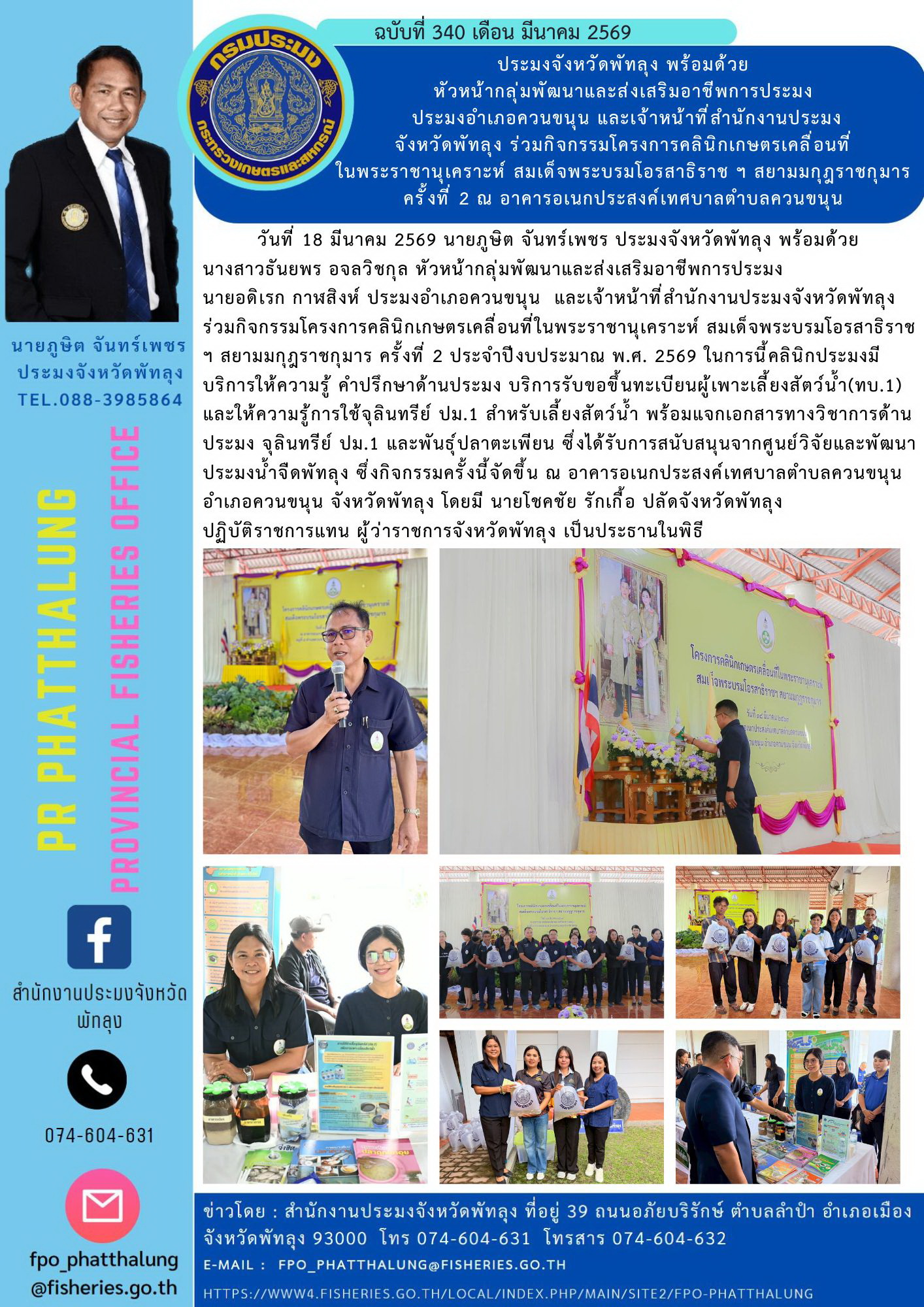 วันที่ 18 มีนาคม 2569 นายภูษิต จันทร์เพชร ประมงจังหวัดพัทลุง พร้อมด้วย นางสาวธันยพร อจลวิชกุล หัวหน้ากลุ่มพัฒนาและส่งเสริมอาชีพการประมง นายอดิเรก กาฬสิงห์ ประมงอำเภอควนขนุน และเจ้าหน้าที่สำนักงานประมงจังหวัดพัทลุง ร่วมกิจกรรมโครงการคลินิกเกษตรเคลื่อนที่ในพระราชานุเคราะห์ สมเด็จพระบรมโอรสาธิราช ฯ สยามมกุฎราชกุมาร ครั้งที่ 2 ประจำปีงบประมาณ พ.ศ. 2569 ในการนี้คลินิกประมงมีบริการให้ความรู้ คำปรึกษาด้านประมง บริการรับขอขึ้นทะเบียนผู้เพาะเลี้ยงสัตว์น้ำ(ทบ.1) และให้ความรู้การใช้จุลินทรีย์ ปม.1 สำหรับเลี้ยงสัตว์น้ำ พร้อมแจกเอกสารทางวิชาการด้านประมง จุลินทรีย์ ปม.1 และพันธุ์ปลาตะเพียน ซึ่งได้รับการสนับสนุนจากศูนย์วิจัยและพัฒนาประมงน้ำจืดพัทลุง ซึ่งกิจกรรมครั้งนี้จัดขึ้น ณ อาคารอเนกประสงค์เทศบาลตำบลควนขนุน อำเภอควนขนุน จังหวัดพัทลุง โดยมี นายโชคชัย รักเกื้อ ปลัดจังหวัดพัทลุง ปฏิบัติราชการแทน ผู้ว่าราชการจังหวัดพัทลุง เป็นประธานในพิธี