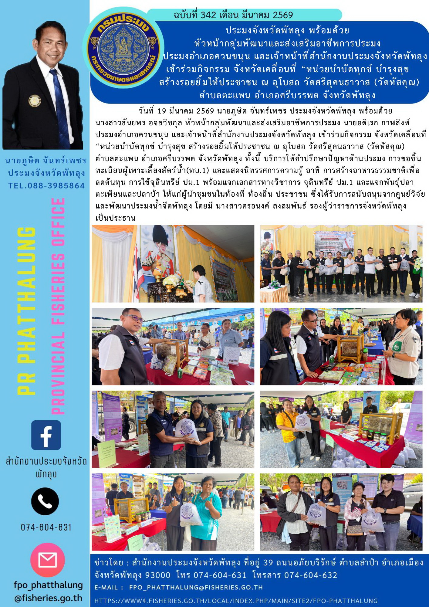 วันที่ 19 มีนาคม 2569 นายภูษิต จันทร์เพชร ประมงจังหวัดพัทลุง พร้อมด้วย นางสาวธันยพร อจลวิชกุล หัวหน้ากลุ่มพัฒนาและส่งเสริมอาชีพการประมง นายอดิเรก กาฬสิงห์ ประมงอำเภอควนขนุน และเจ้าหน้าที่สำนักงานประมงจังหวัดพัทลุง เข้าร่วมกิจกรรม จังหวัดเคลื่อนที่ “หน่วยบำบัดทุกข์ บำรุงสุข สร้างรอยยิ้มให้ประชาชน ณ อุโบสถ วัดศรีสุคนธาวาส (วัดหัสคุณ) ตำบลตะแพน อำเภอศรีบรรพต จังหวัดพัทลุง ทั้งนี้ บริการให้คำปรึกษาปัญหาด้านประมง การขอขึ้นทะเบียนผู้เพาะเลี้ยงสัตว์น้ำ(ทบ.1) และแสดงนิทรรศการความรู้ อาทิ การสร้างอาหารธรรมชาติเพื่อลดต้นทุน การใช้จุลินทรีย์ ปม.1 พร้อมแจกเอกสารทางวิชาการ จุลินทรีย์ ปม.1 และแจกพันธุ์ปลาตะเพียนและปลาบ้า ให้แก่ผู้นำชุมชนในท้องที่ ท้องถิ่น ประชาชน ซึ่งได้รับการสนับสนุนจากศูนย์วิจัยและพัฒนาประมงน้ำจืดพัทลุง โดยมี นางสาวศรอนงค์ สงสมพันธ์ รองผู้ว่าราชการจังหวัดพัทลุง เป็นประธาน