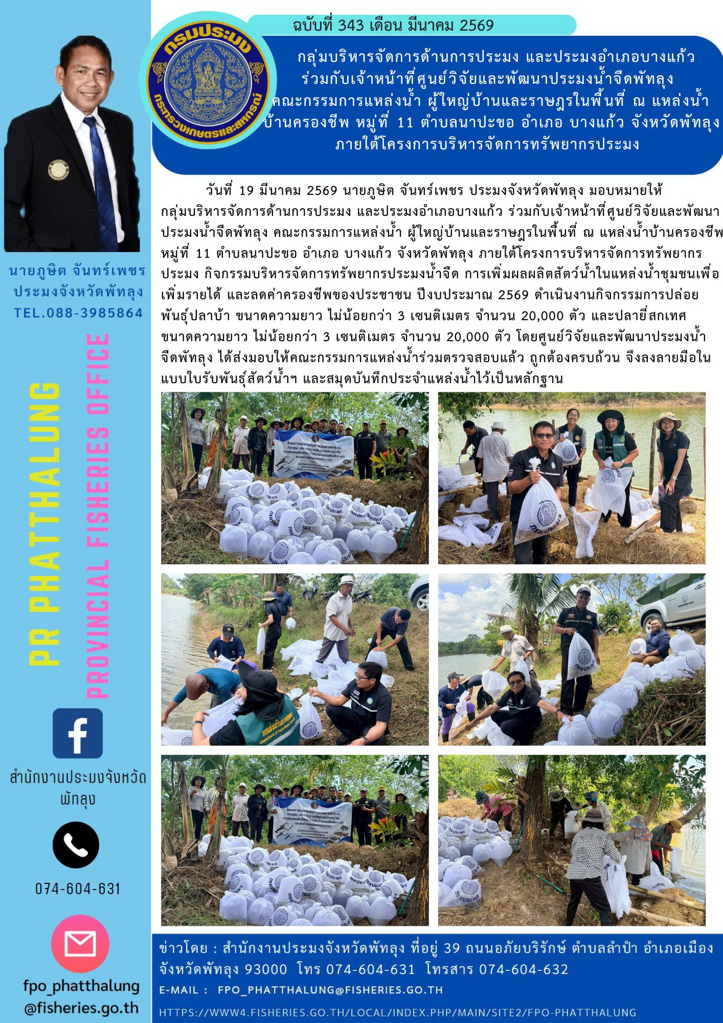 วันที่ 19 มีนาคม 2569 นายภูษิต จันทร์เพชร ประมงจังหวัดพัทลุง มอบหมายให้ กลุ่มบริหารจัดการด้านการประมง และประมงอำเภอบางแก้ว ร่วมกับเจ้าหน้าที่ศูนย์วิจัยและพัฒนาประมงน้ำจืดพัทลุง คณะกรรมการแหล่งน้ำ ผู้ใหญ่บ้านและราษฎรในพื้นที่ ณ แหล่งน้ำบ้านครองชีพ หมู่ที่ 11 ตำบลนาปะขอ อำเภอ บางแก้ว จังหวัดพัทลุง ภายใต้โครงการบริหารจัดการทรัพยากรประมง กิจกรรมบริหารจัดการทรัพยากรประมงน้ำจืด การเพิ่มผลผลิตสัตว์น้ำในแหล่งน้ำชุมชนเพื่อเพิ่มรายได้ และลดค่าครองชีพของประชาชน ปีงบประมาณ 2569 ดำเนินงานกิจกรรมการปล่อยพันธุ์ปลาบ้า ขนาดความยาว ไม่น้อยกว่า 3 เซนติเมตร จำนวน 20,000 ตัว และปลายี่สกเทศ ขนาดความยาว ไม่น้อยกว่า 3 เซนติเมตร จำนวน 20,000 ตัว โดยศูนย์วิจัยและพัฒนาประมงน้ำจืดพัทลุง ได้ส่งมอบให้คณะกรรมการแหล่งน้ำร่วมตรวจสอบแล้ว ถูกต้องครบถ้วน จึงลงลายมือในแบบใบรับพันธุ์สัตว์น้ำฯ และสมุดบันทึกประจำแหล่งน้ำไว้เป็นหลักฐาน
