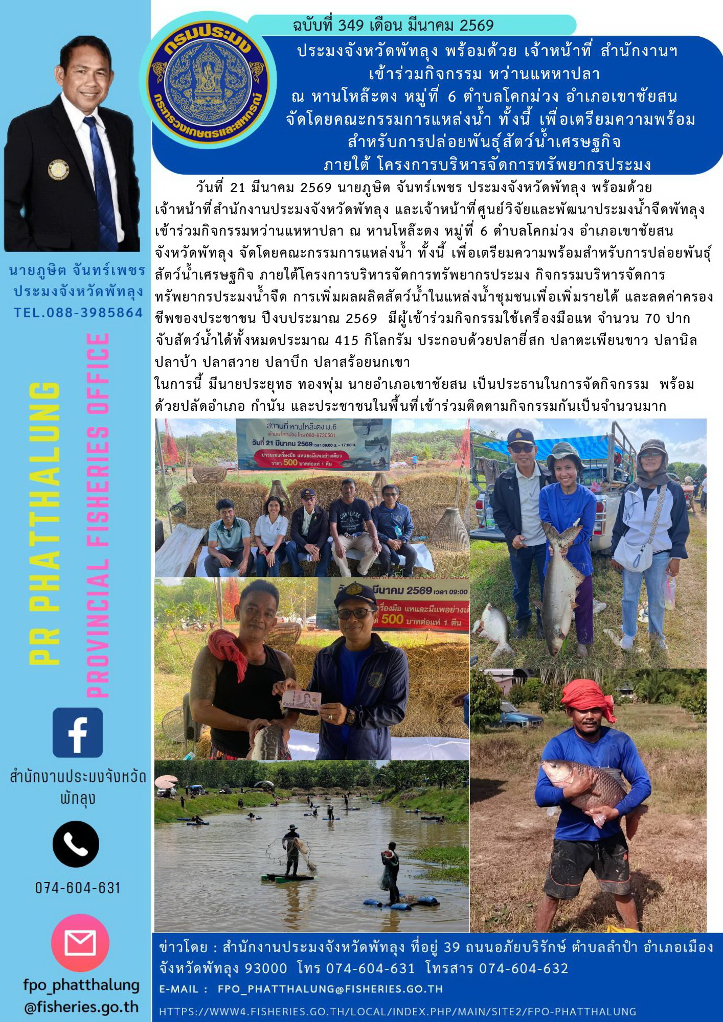 วันที่ 21 มีนาคม 2569 นายภูษิต จันทร์เพชร ประมงจังหวัดพัทลุง พร้อมด้วย เจ้าหน้าที่สำนักงานประมงจังหวัดพัทลุง และเจ้าหน้าที่ศูนย์วิจัยและพัฒนาประมงน้ำจืดพัทลุง เข้าร่วมกิจกรรมหว่านแหหาปลา ณ หานโหล๊ะตง หมู่ที่ 6 ตำบลโคกม่วง อำเภอเขาชัยสน จังหวัดพัทลุง จัดโดยคณะกรรมการแหล่งน้ำ ทั้งนี้ เพื่อเตรียมความพร้อมสำหรับการปล่อยพันธุ์สัตว์น้ำเศรษฐกิจ ภายใต้โครงการบริหารจัดการทรัพยากรประมง กิจกรรมบริหารจัดการทรัพยากรประมงน้ำจืด การเพิ่มผลผลิตสัตว์น้ำในแหล่งน้ำชุมชนเพื่อเพิ่มรายได้ และลดค่าครองชีพของประชาชน ปีงบประมาณ 2569 มีผู้เข้าร่วมกิจกรรมใช้เครื่องมือแห จำนวน 70 ปาก จับสัตว์น้ำได้ทั้งหมดประมาณ 415 กิโลกรัม ประกอบด้วยปลายี่สก ปลาตะเพียนขาว ปลานิล ปลาบ้า ปลาสวาย ปลาบึก ปลาสร้อยนกเขา ในการนี้ มีนายประยุทธ ทองพุ่ม นายอำเภอเขาชัยสน เป็นประธานในการจัดกิจกรรม พร้อมด้วยปลัดอำเภอ กำนัน และประชาชนในพื้นที่เข้าร่วมติดตามกิจกรรมกันเป็นจำนวนมาก