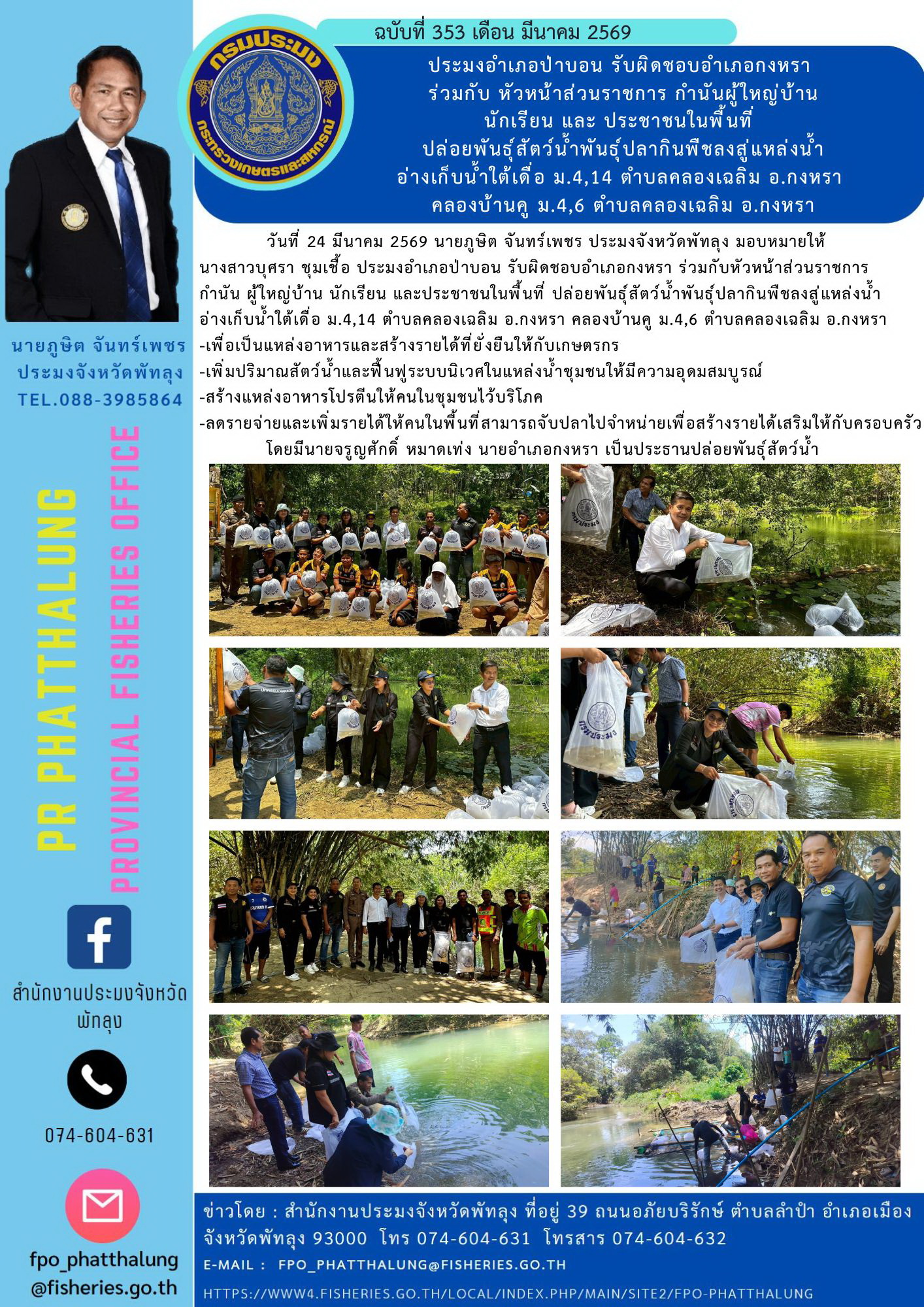 วันที่ 24 มีนาคม 2569 นายภูษิต จันทร์เพชร ประมงจังหวัดพัทลุง มอบหมายให้ นางสาวบุศรา ชุมเชื้อ ประมงอำเภอป่าบอน รับผิดชอบอำเภอกงหรา ร่วมกับหัวหน้าส่วนราชการ