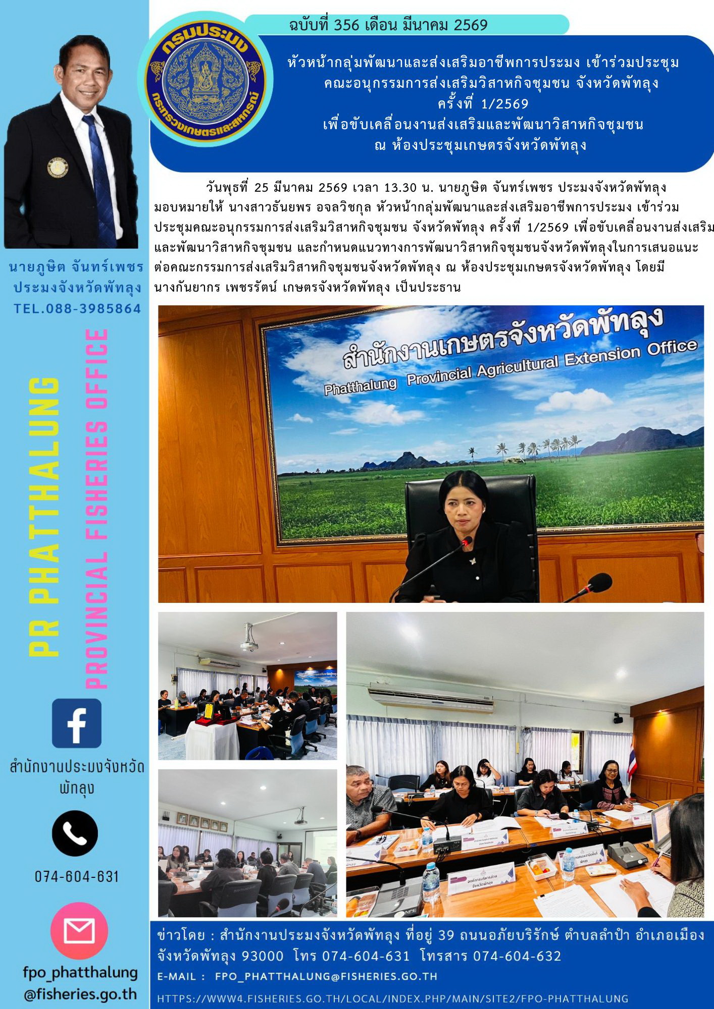 วันพุธที่ 25 มีนาคม 2569 เวลา 13.30 น. นายภูษิต จันทร์เพชร ประมงจังหวัดพัทลุง มอบหมายให้ นางสาวธันยพร อจลวิชกุล หัวหน้ากลุ่มพัฒนาและส่งเสริมอาชีพการประมง เข้าร่วมประชุมคณะอนุกรรมการส่งเสริมวิสาหกิจชุมชน จังหวัดพัทลุง ครั้งที่ 1/2569 เพื่อขับเคลื่อนงานส่งเสริมและพัฒนาวิสาหกิจชุมชน และกำหนดแนวทางการพัฒนาวิสาหกิจชุมชนจังหวัดพัทลุงในการเสนอแนะต่อคณะกรรมการส่งเสริมวิสาหกิจชุมชนจังหวัดพัทลุง ณ ห้องประชุมเกษตรจังหวัดพัทลุง โดยมี นางกันยากร เพชรรัตน์ เกษตรจังหวัดพัทลุง เป็นประธาน