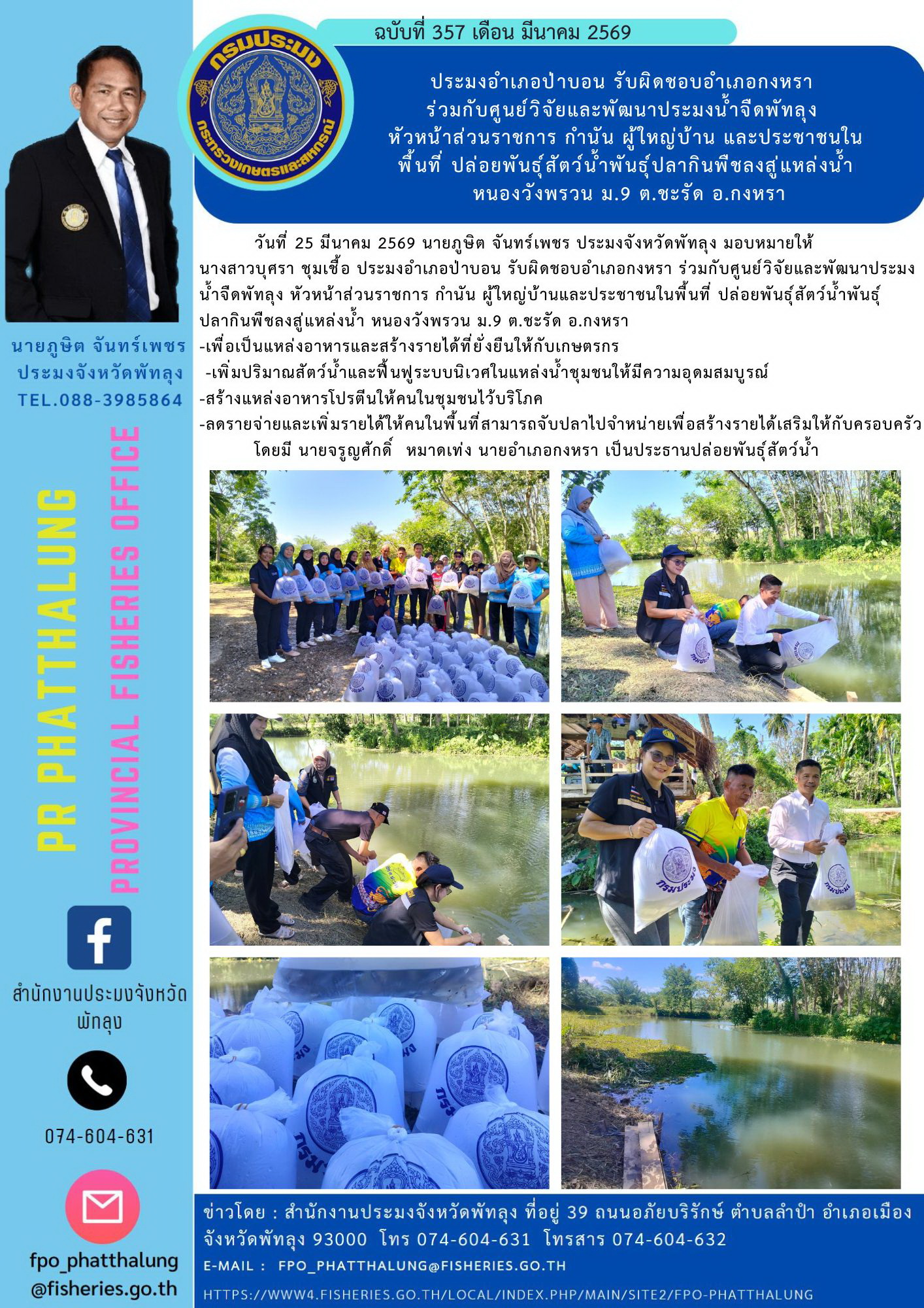 วันที่ 25 มีนาคม 2569 นายภูษิต จันทร์เพชร ประมงจังหวัดพัทลุง มอบหมายให้ นางสาวบุศรา ชุมเชื้อ ประมงอำเภอป่าบอน รับผิดชอบอำเภอกงหรา ร่วมกับศูนย์วิจัยและพัฒนาประมงน้ำจืดพัทลุง หัวหน้าส่วนราชการ กำนัน ผู้ใหญ่บ้านและประชาชนในพื้นที่ ปล่อยพันธุ์สัตว์น้ำพันธุ์ปลากินพืชลงสู่แหล่งน้ำ หนองวังพรวน ม.9 ต.ชะรัด อ.กงหรา