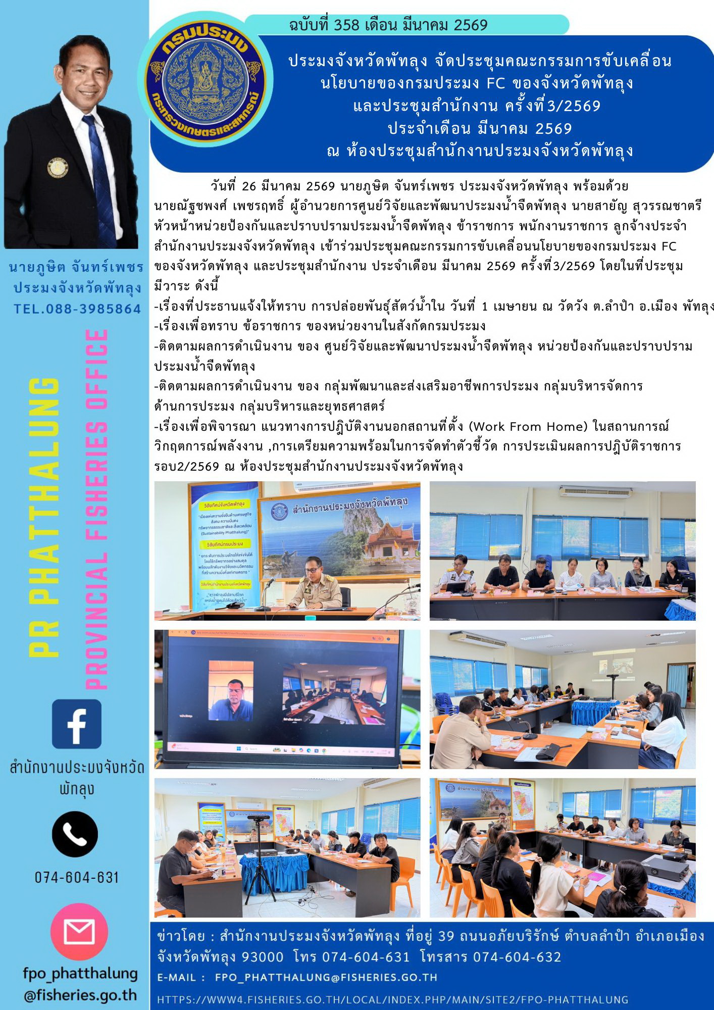 วันที่ 26 มีนาคม 2569 นายภูษิต จันทร์เพชร ประมงจังหวัดพัทลุง พร้อมด้วย นายณัฐชพงศ์ เพชรฤทธิ์ ผู้อำนวยการศูนย์วิจัยและพัฒนาประมงน้ำจืดพัทลุง นายสายัญ สุวรรณชาตรี หัวหน้าหน่วยป้องกันและปราบปรามประมงน้ำจืดพัทลุง ข้าราชการ พนักงานราชการ ลูกจ้างประจำ สำนักงานประมงจังหวัดพัทลุง เข้าร่วมประชุมคณะกรรมการขับเคลื่อนนโยบายของกรมประมง FC ของจังหวัดพัทลุง และประชุมสำนักงาน ประจำเดือน มีนาคม 2569 ครั้งที่3/2569 โดยในที่ประชุม