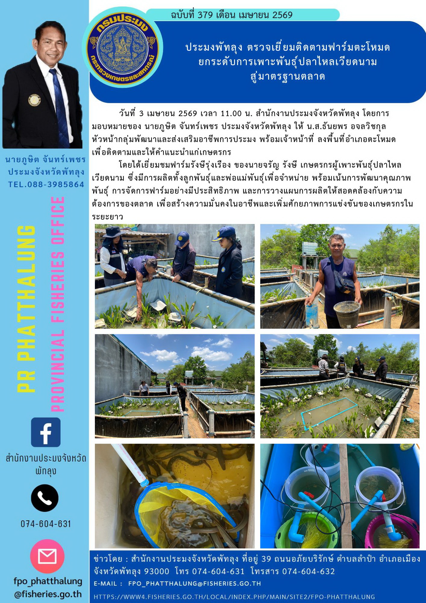 วันที่ 3 เมษายน 2569 เวลา 11.00 น. สำนักงานประมงจังหวัดพัทลุง โดยการ มอบหมายของ นายภูษิต จันทร์เพชร ประมงจังหวัดพัทลุง ให้ น.ส.ธันยพร อจลวิชกุล หัวหน้ากลุ่มพัฒนาและส่งเสริมอาชีพการประมง พร้อมเจ้าหน้าที่ ลงพื้นที่อำเภอตะโหมด เพื่อติดตามและให้คำแนะนำแก่เกษตรกร โดยได้เยี่ยมชมฟาร์มรังษีรุ่งเรือง ของนายจรัญ รังษี เกษตรกรผู้เพาะพันธุ์ปลาไหลเวียดนาม ซึ่งมีการผลิตทั้งลูกพันธุ์และพ่อแม่พันธุ์เพื่อจำหน่าย พร้อมเน้นการพัฒนาคุณภาพพันธุ์ การจัดการฟาร์มอย่างมีประสิทธิภาพ และการวางแผนการผลิตให้สอดคล้องกับความต้องการของตลาด เพื่อสร้างความมั่นคงในอาชีพและเพิ่มศักยภาพการแข่งขันของเกษตรกรในระยะยาว