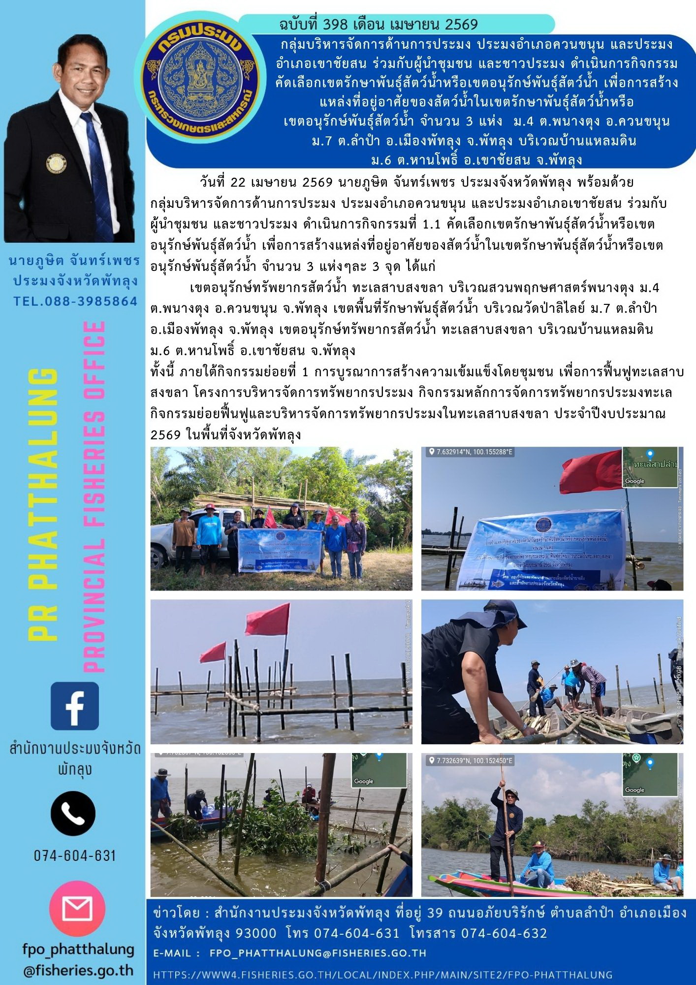 วันที่ 22 เมษายน 2569 นายภูษิต จันทร์เพชร ประมงจังหวัดพัทลุง พร้อมด้วย กลุ่มบริหารจัดการด้านการประมง ประมงอำเภอควนขนุน และประมงอำเภอเขาชัยสน ร่วมกับผู้นำชุมชน และชาวประมง ดำเนินการกิจกรรมที่ 1.1 คัดเลือกเขตรักษาพันธุ์สัตว์น้ำหรือเขตอนุรักษ์พันธุ์สัตว์น้ำ เพื่อการสร้างแหล่งที่อยู่อาศัยของสัตว์น้ำในเขตรักษาพันธุ์สัตว์น้ำหรือเขตอนุรักษ์พันธุ์สัตว์น้ำ จำนวน 3 แห่งๆละ 3 จุด ได้แก่? เขตอนุรักษ์ทรัพยากรสัตว์น้ำ ทะเลสาบสงขลา บริเวณสวนพฤกษศาสตร์พนางตุง ม.4 ต.พนางตุง อ.ควนขนุน จ.พัทลุง เขตพื้นที่รักษาพันธุ์สัตว์น้ำ บริเวณวัดป่าลิไลย์ ม.7 ต.ลำปำ อ.เมืองพัทลุง จ.พัทลุง เขตอนุรักษ์ทรัพยากรสัตว์น้ำ ทะเลสาบสงขลา บริเวณบ้านแหลมดิน ม.6 ต.หานโพธิ์ อ.เขาชัยสน จ.พัทลุง ทั้งนี้ ภายใต้กิจกรรมย่อยที่ 1 การบูรณาการสร้างความเข้มแข็งโดยชุมชน เพื่อการฟื้นฟูทะเลสาบสงขลา โครงการบริหารจัดการทรัพยากรประมง กิจกรรมหลักการจัดการทรัพยากรประมงทะเล กิจกรรมย่อยฟื้นฟูและบริหารจัดการทรัพยากรประมงในทะเลสาบสงขลา ประจำปีงบประมาณ 2569 ในพื้นที่จังหวัดพัทลุง