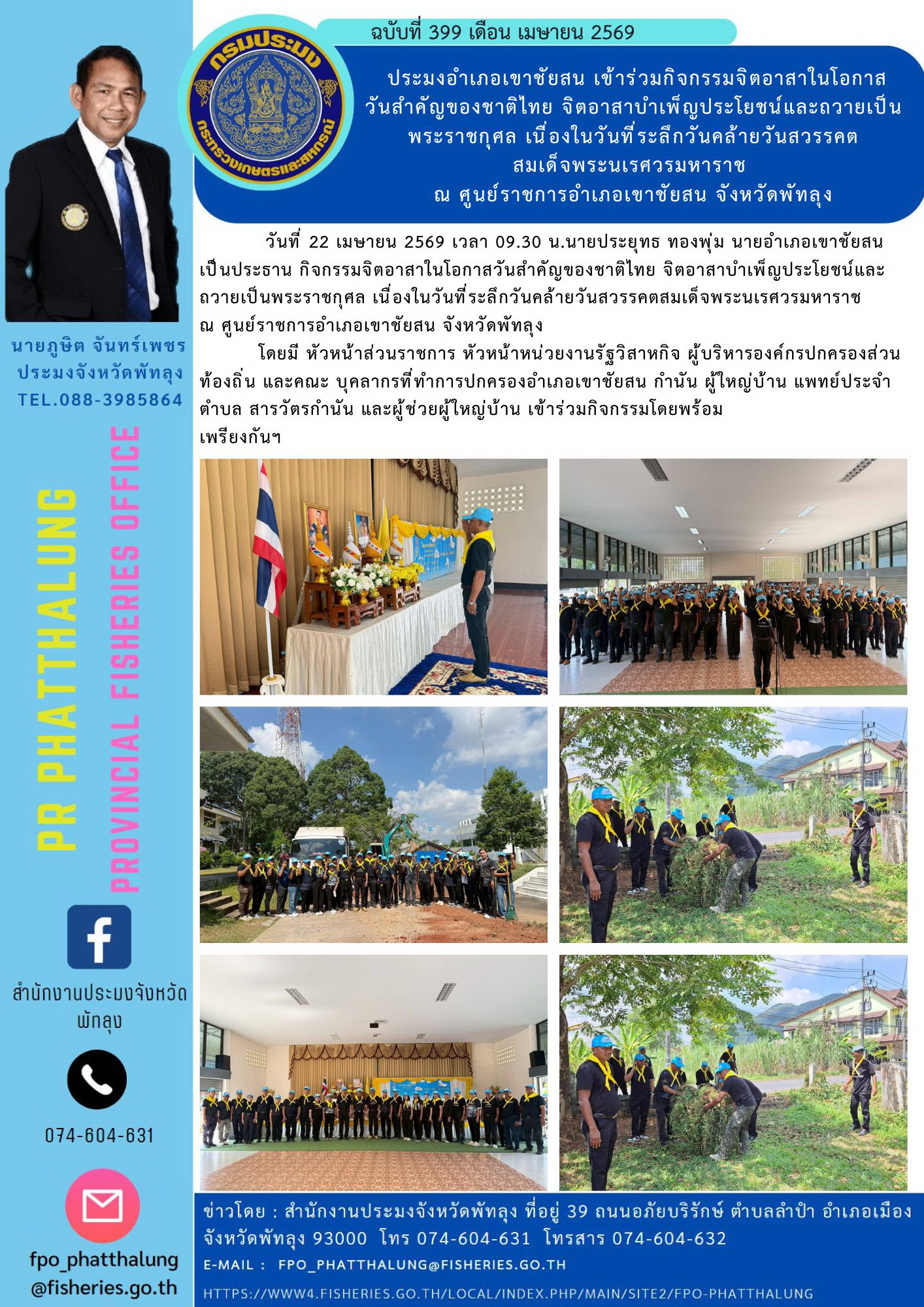 ประมงอำเภอเขาชัยสน เข้าร่วมกิจกรรมจิตอาสาในโอกาส วันสำคัญของชาติไทย จิตอาสาบำเพ็ญประโยชน์และถวายเป็น พระราชกุศล เนื่องในวันที่ระลึกวันคล้ายวันสวรรคต สมเด็จพระนเรศวรมหาราช ณ ศูนย์ราชการอำเภอเขาชัยสน จังหวัดพัทลุง