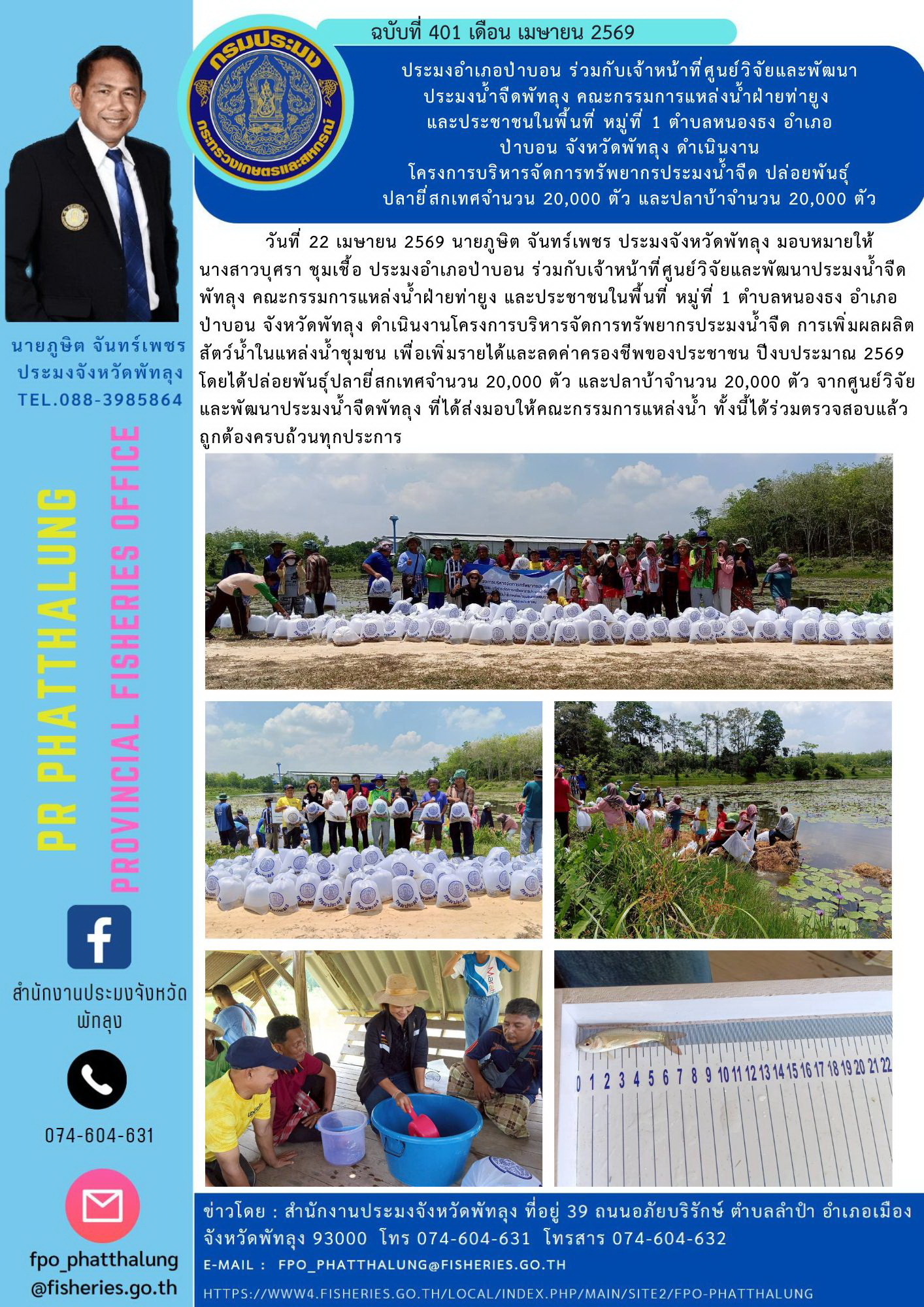 วันที่ 22 เมษายน 2569 นายภูษิต จันทร์เพชร ประมงจังหวัดพัทลุง มอบหมายให้นางสาวบุศรา ชุมเชื้อ ประมงอำเภอป่าบอน ร่วมกับเจ้าหน้าที่ศูนย์วิจัยและพัฒนาประมงน้ำจืดพัทลุง คณะกรรมการแหล่งน้ำฝ่ายท่ายูง และประชาชนในพื้นที่ หมู่ที่ 1 ตำบลหนองธง อำเภอป่าบอน จังหวัดพัทลุง ดำเนินงานโครงการบริหารจัดการทรัพยากรประมงน้ำจืด การเพิ่มผลผลิตสัตว์น้ำในแหล่งน้ำชุมชน เพื่อเพิ่มรายได้และลดค่าครองชีพของประชาชน ปีงบประมาณ 2569 โดยได้ปล่อยพันธุ์ปลายี่สกเทศจำนวน 20,000 ตัว และปลาบ้าจำนวน 20,000 ตัว จากศูนย์วิจัยและพัฒนาประมงน้ำจืดพัทลุง ที่ได้ส่งมอบให้คณะกรรมการแหล่งน้ำ ทั้งนี้ได้ร่วมตรวจสอบแล้วถูกต้องครบถ้วนทุกประการ
