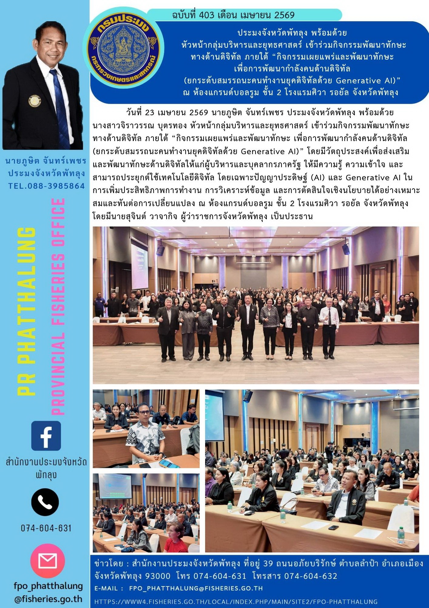 วันที่ 23 เมษายน 2569 นายภูษิต จันทร์เพชร ประมงจังหวัดพัทลุง พร้อมด้วย นางสาวจิราวรรณ บุตรทอง หัวหน้ากลุ่มบริหารและยุทธศาสตร์ เข้าร่วมกิจกรรมพัฒนาทักษะทางด้านดิจิทัล ภายใต้ “กิจกรรมเผยแพร่และพัฒนาทักษะ เพื่อการพัฒนากำลังคนด้านดิจิทัล (ยกระดับสมรรถนะคนทำงานยุคดิจิทัลด้วย Generative AI)” โดยมีวัตถุประสงค์เพื่อส่งเสริมและพัฒนาทักษะด้านดิจิทัลให้แก่ผู้บริหารและบุคลากรภาครัฐ ให้มีความรู้ ความเข้าใจ และสามารถประยุกต์ใช้เทคโนโลยีดิจิทัล โดยเฉพาะปัญญาประดิษฐ์ (AI) และ Generative AI ในการเพิ่มประสิทธิภาพการทำงาน การวิเคราะห์ข้อมูล และการตัดสินใจเชิงนโยบายได้อย่างเหมาะสมและทันต่อการเปลี่ยนแปลง ณ ห้องแกรนด์บอลรูม ชั้น 2 โรงแรมศิวา รอยัล จังหวัดพัทลุง โดยมีนายสุจินต์ วาจากิจ ผู้ว่าราชการจังหวัดพัทลุง เป็นประธาน