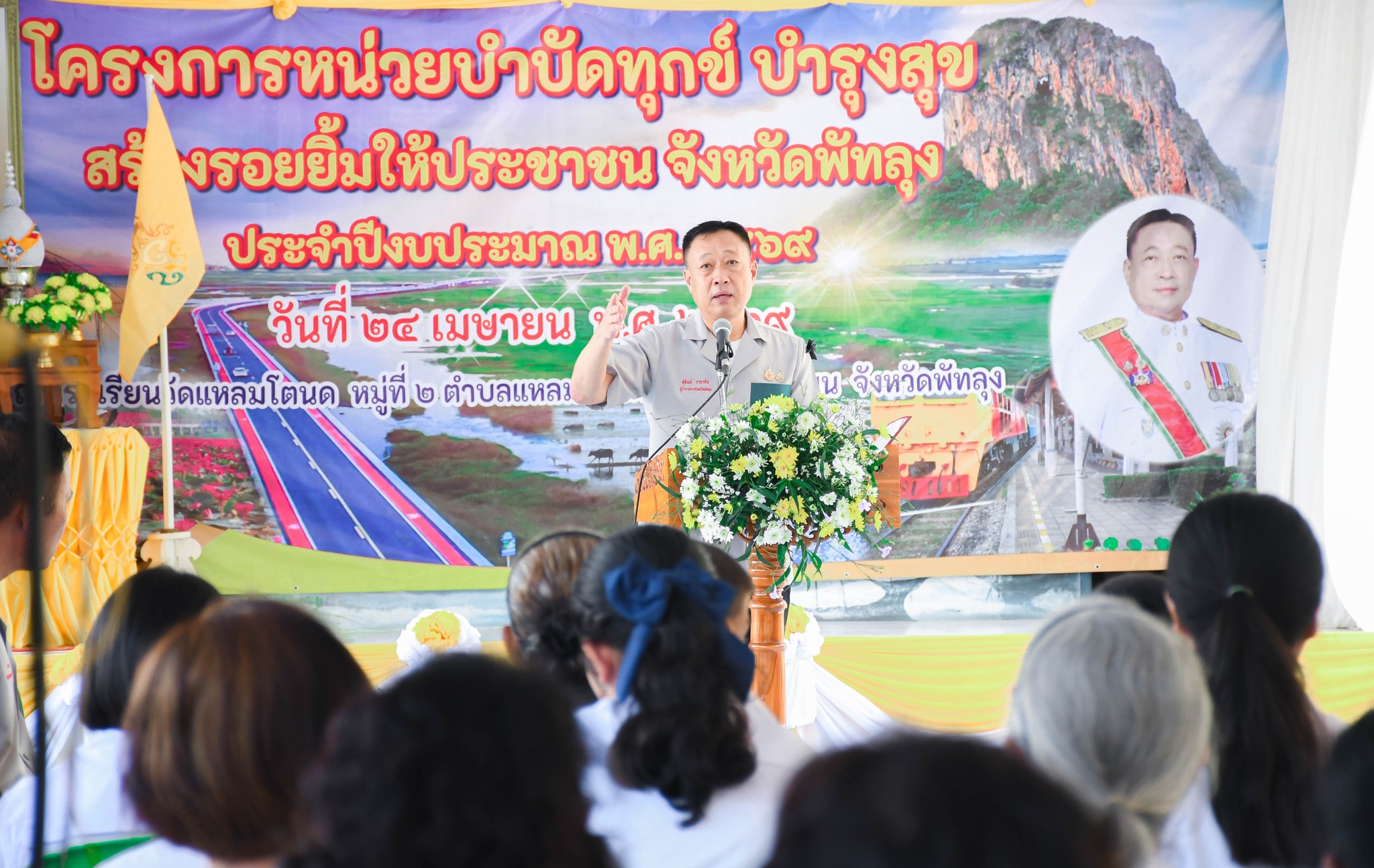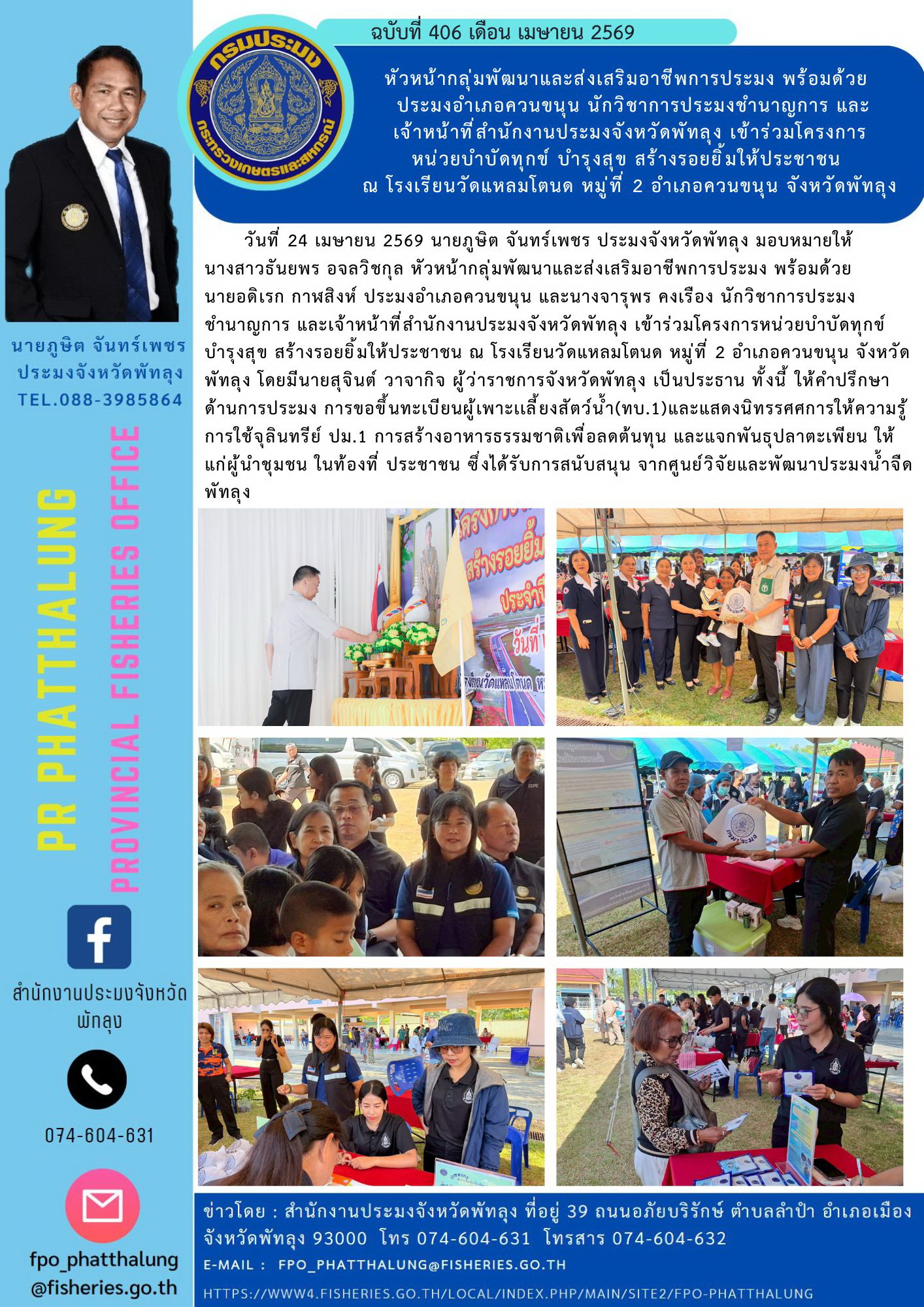 วันที่ 24 เมษายน 2569 นายภูษิต จันทร์เพชร ประมงจังหวัดพัทลุง มอบหมายให้ นางสาวธันยพร อจลวิชกุล หัวหน้ากลุ่มพัฒนาและส่งเสริมอาชีพการประมง พร้อมด้วย นายอดิเรก กาฬสิงห์ ประมงอำเภอควนขนุน และนางจารุพร คงเรือง นักวิชาการประมงชำนาญการ และเจ้าหน้าที่สำนักงานประมงจังหวัดพัทลุง เข้าร่วมโครงการหน่วยบำบัดทุกข์ บำรุงสุข สร้างรอยยิ้มให้ประชาชน ณ โรงเรียนวัดแหลมโตนด หมู่ที่ 2 อำเภอควนขนุน จังหวัดพัทลุง โดยมีนายสุจินต์ วาจากิจ ผู้ว่าราชการจังหวัดพัทลุง เป็นประธาน ทั้งนี้ ให้คำปรึกษาด้านการประมง การขอขึ้นทะเบียนผู้เพาะเเลี้ยงสัตว์น้ำ(ทบ.1)และแสดงนิทรรศศการให้ความรู้ การใช้จุลินทรีย์ ปม.1 การสร้างอาหารธรรมชาติเพื่อลดต้นทุน และแจกพันธุปลาตะเพียน ให้แก่ผู้นำชุมชน ในท้องที่ ประชาชน ซึ่งได้รับการสนับสนุน จากศูนย์วิจัยและพัฒนาประมงน้ำจืดพัทลุง