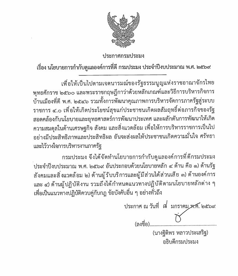 นโยบายการกำกับดูแลองค์การที่ดี กรมประมง ประจำปีงบประมาณ พ.ศ. 2569