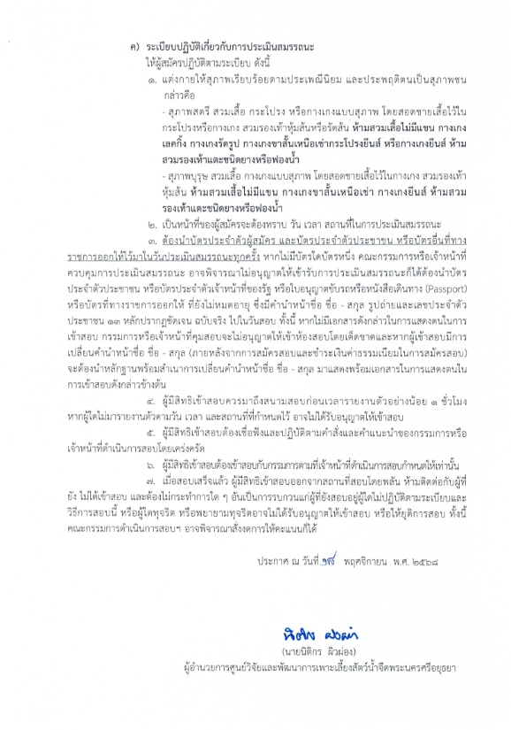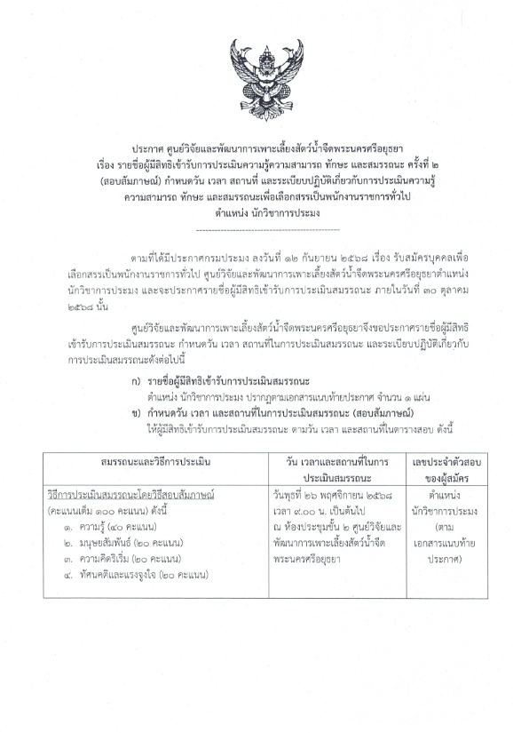 ประกาศ ศูนย์วิจัยและพัฒนาการเพาะเลี้ยงสัตว์น้ำจืดพระนครศรีอยุธยา เรื่อง รายชื่่อผู้มีสิทธิ์เข้ารับการประเมินความรู้ความสามารถ ทักษะ และสมรรถนะ ครั้งที่ 2 (สอบสัมภาษณ์) กำหนดวัน เวลา สถานที่ และระเบียบปฏิบัติเกี่ยวกับการประเมินความรู้ความสามารถ ทักษะ และสมรรถนะเพื่อเลือกสรรเป็นพนักงานราชการทั่วไป ตำแหน่ง นักวิชาการประมง
