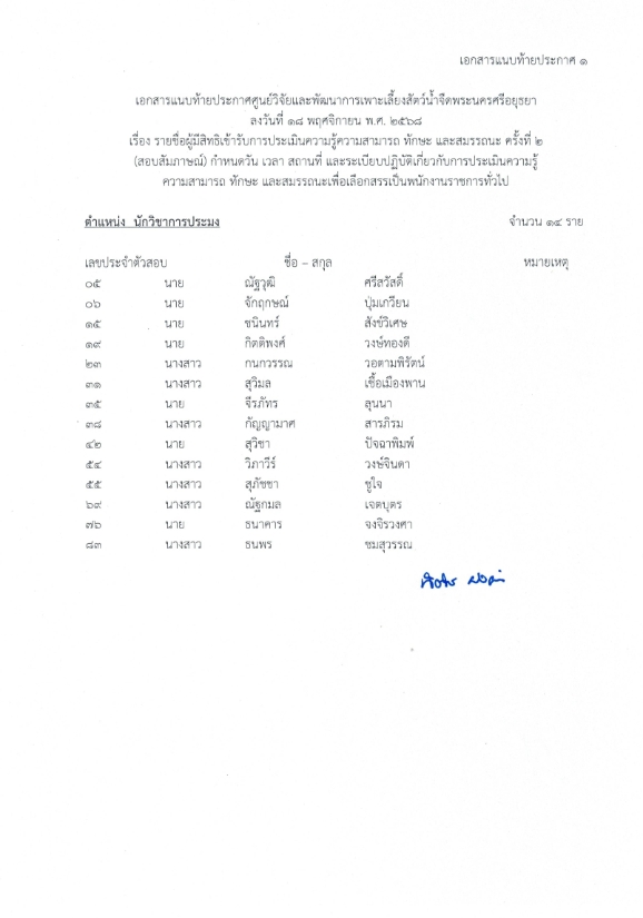 ประกาศ ศูนย์วิจัยและพัฒนาการเพาะเลี้ยงสัตว์น้ำจืดพระนครศรีอยุธยา เรื่อง รายชื่่อผู้มีสิทธิ์เข้ารับการประเมินความรู้ความสามารถ ทักษะ และสมรรถนะ ครั้งที่ 2 (สอบสัมภาษณ์) ตำแหน่ง นักวิชาการประมง
