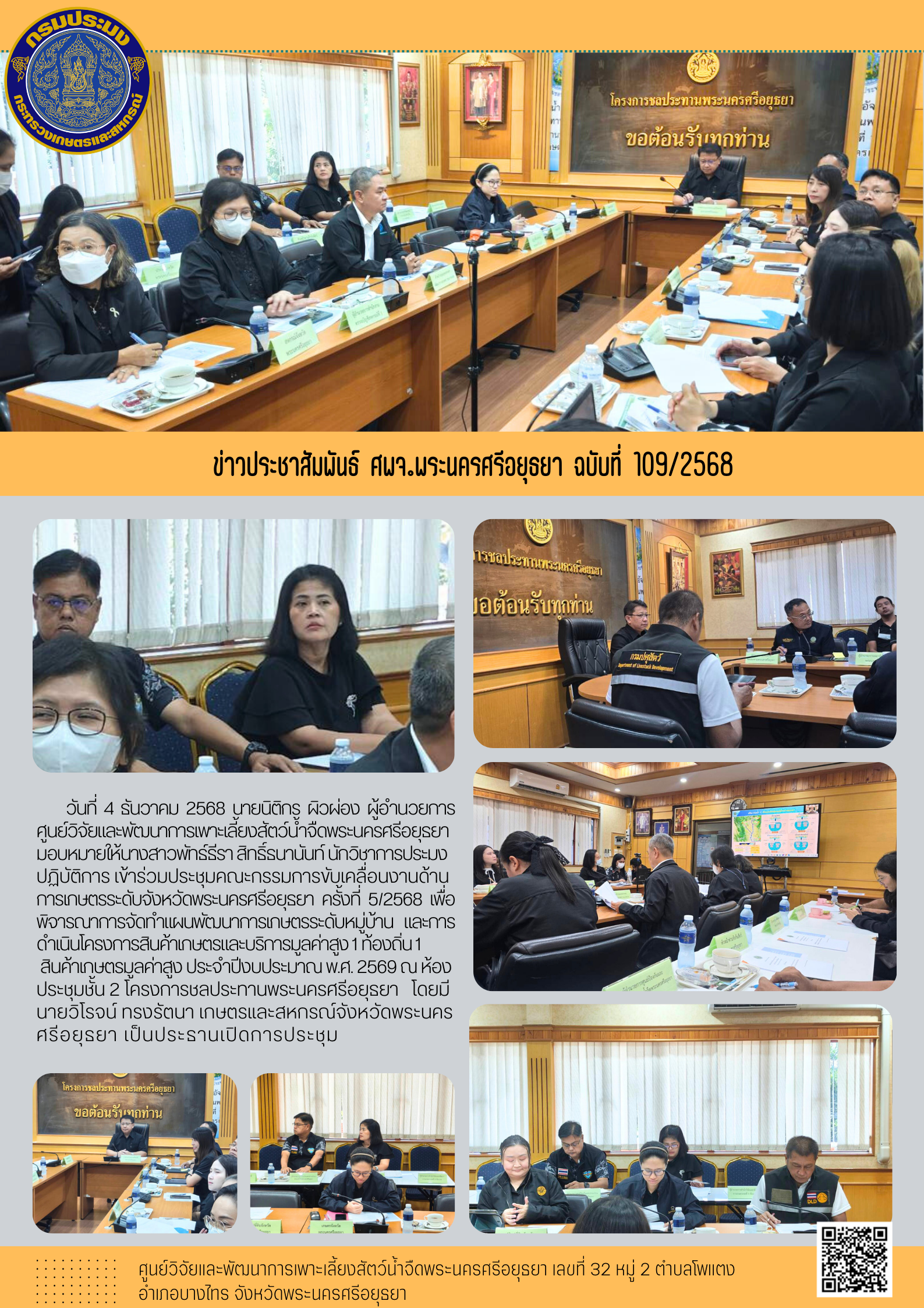 ปฏิบัติการ เข้าร่วมประชุมคณะกรรมการขับเคลื่อนงานด้านการเกษตรระดับจังหวัดพระนครศรีอยุธยา ครั้งที่ 5/2568 เพื่อพิจารณาการจัดทำแผนพัฒนาการเกษตรระดับหมู่บ้าน และการดำเนินโครงการสินค้าเกษตรและบริการมูลค่าสูง 1 ท้องถิ่น 1 สินค้าเกษตรมูลค่าสูง ประจำปีงบประมาณ พ.ศ. 2569 ณ ห้องประชุมชั้น 2 โครงการชลประทานพระนครศรีอยุธยา โดยมี