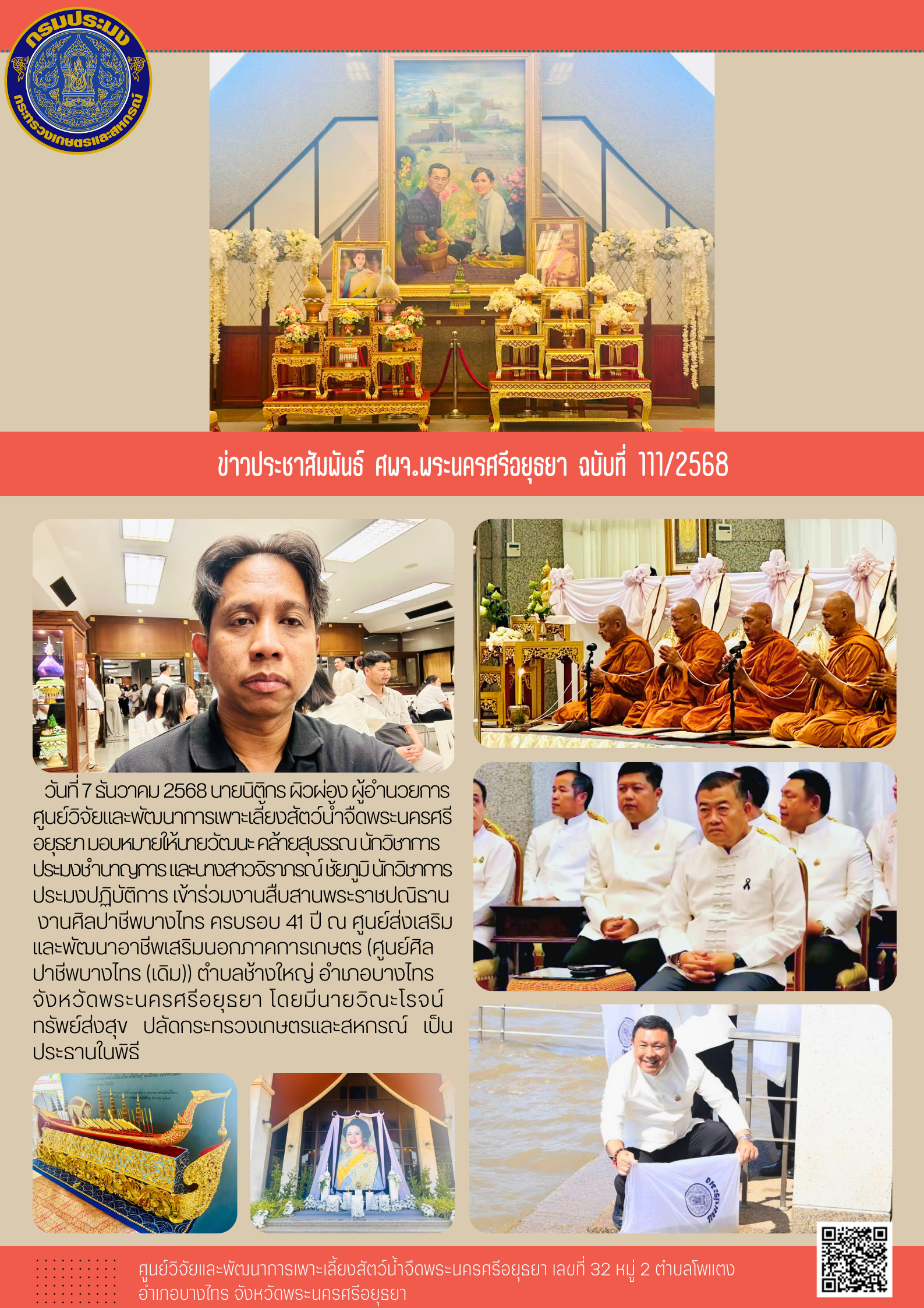 วันที่ 7 ธันวาคม 2568 นายนิติกร ผิวผ่อง ผู้อำนวยการศูนย์วิจัยและพัฒนาการเพาะเลี้ยงสัตว์น้ำจืดพระนครศรีอยุธยา มอบหมายให้นายวัฒนะ คล้ายสุบรรณ นักวิชาการประมงชำนาญการ และนางสาวจิราภรณ์ ชัยภูมิ นักวิชาการประมงปฏิบัติการ เข้าร่วมงานสืบสานพระราชปณิธานงานศิลปาชีพบางไทร ครบรอบ 41 ปี ณ ศูนย์ส่งเสริมและพัฒนาอาชีพเสริมนอกภาคการเกษตร (ศูนย์ศิลปาชีพบางไทร (เดิม)) ตำบลช้างใหญ่ อำเภอบางไทรจังหวัดพระนครศรีอยุธยา โดยมีนายวิณะโรจน์ทรัพย์ส่งสุข ปลัดกระทรวงเกษตรและสหกรณ์ เป็นประธานในพิธี