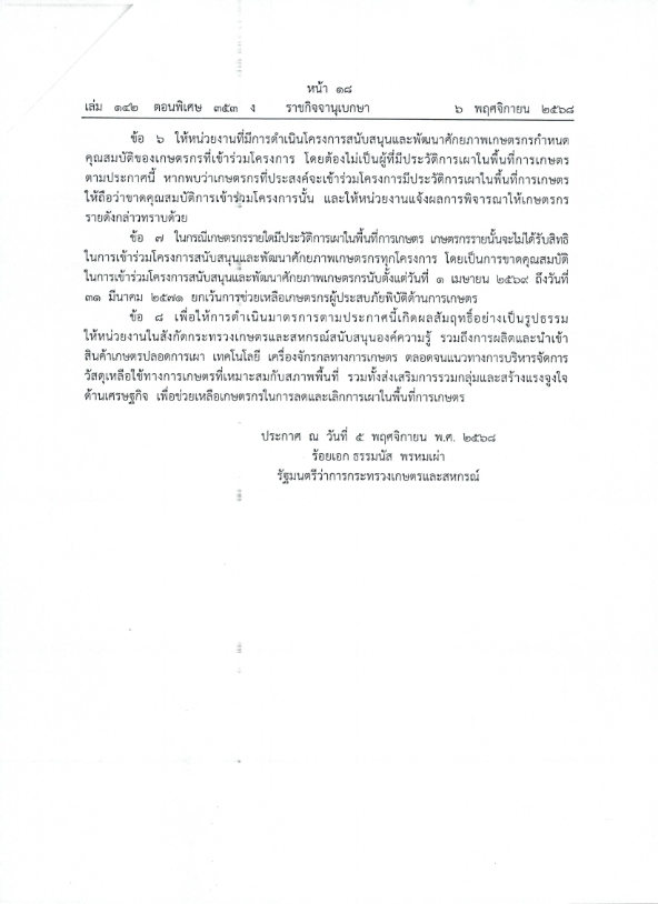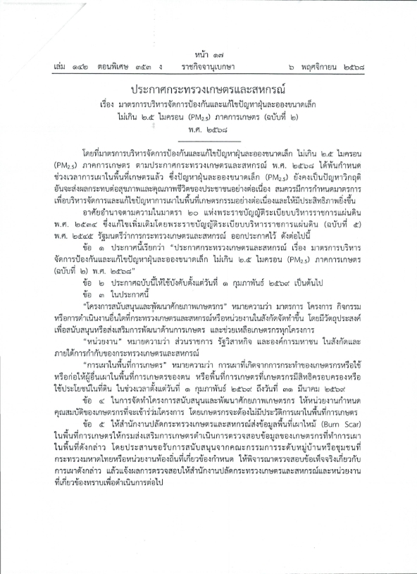 ประกาศกระทรวงเกษตรและสหกรณ์ เรื่องมาตรการบริหารจัดการป้องกันและแก้ไขปัญหาฝุ่นละอองขนาดเล็ก ไม่เกิน 2.5 ไมครอน (PM 2.5) ภาคการเกษตร (ฉบับที่ 2)
