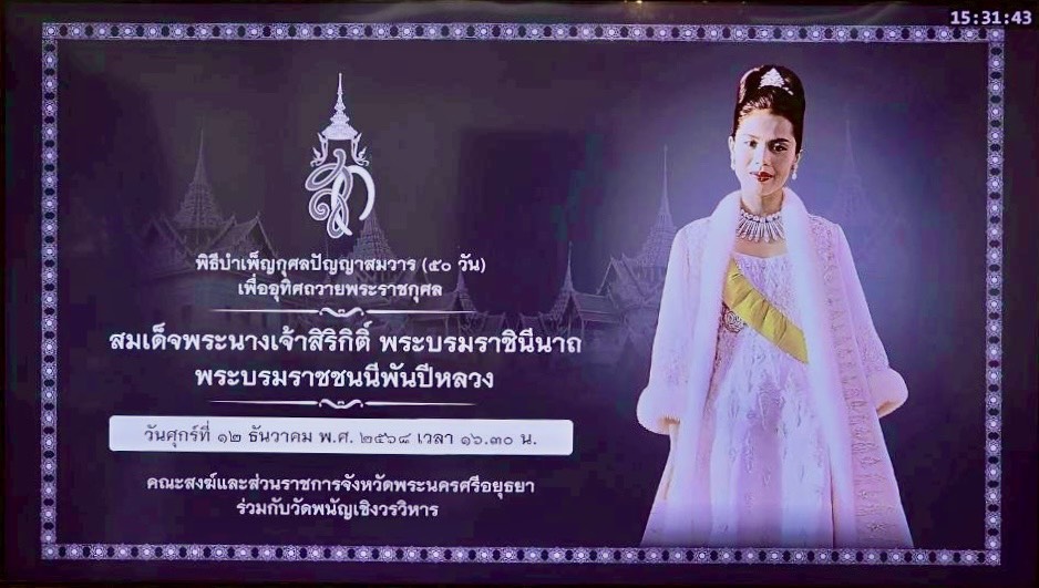 วันที่ 12 ธันวาคม 2568 นายนิติกร ผิวผ่อง ผู้อำนวยการศูนย์วิจัยและพัฒนาการเพาะเลี้ยงสัตว์น้ำจืดพระนครศรีอยุธยา มอบหมายให้นายวัฒนะ คล้ายสุบรรณ นักวิชาการประมงชำนาญการ เข้าร่วมพิธีบำเพ็ญกุศลปัญญาสมวาร (50 วัน) เพื่อถวายเป็นพระราชกุศลแด่ สมเด็จพระนางเจ้าสิริกิติ์ พระบรมราชินีนาถ พระบรมราชชนนีพันปีหลวง ณ หอประชุมสงฆ์ วัดพนัญเชิงวรวิหาร อำเภอพระนครศรีอยุธยา จังหวัดพระนครศรีอยุธยา โดยมีนายชวนินทร์ วงศ์สถิตจิรกาล ผู้ว่าราชการจังหวัดพระนครศรีอยุธยา เป็นประธานในพิธี