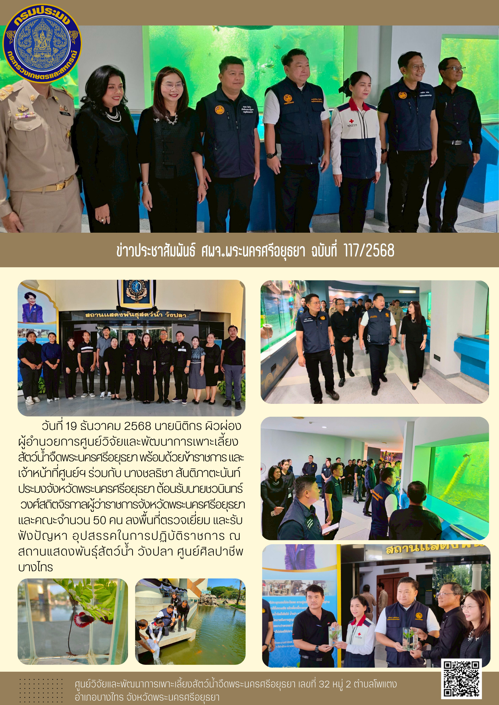 วันที่ 19 ธันวาคม 2568 นายนิติกร ผิวผ่อง ผู้อำนวยการศูนย์วิจัยและพัฒนาการเพาะเลี้ยงสัตว์น้ำจืดพระนครศรีอยุธยา พร้อมด้วยข้าราชการ และเจ้าหน้าที่ศูนย์ฯ ร่วมกับ นางชลธิชา สันติภาตะนันท์ ประมงจังหวัดพระนครศรีอยุธยา ต้อนรับนายชวนินทร์ วงศ์สถิตจิรกาล ผู้ว่าราชการจังหวัดพระนครศรีอยุธยา และคณะจำนวน 50 คน ลงพื้นที่ตรวจเยี่ยม และรับฟังปัญหา อุปสรรคในการปฏิบัติราชการ ณสถานแสดงพันธ์ุสัตว์น้ำ วังปลา ศูนย์ศิลปาชีพบางไทร