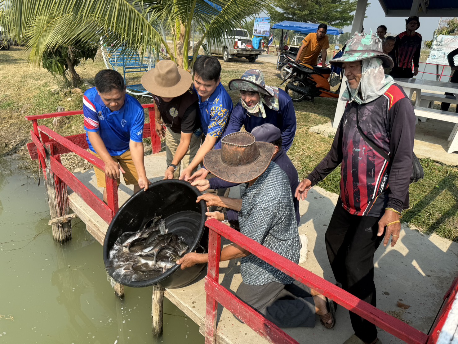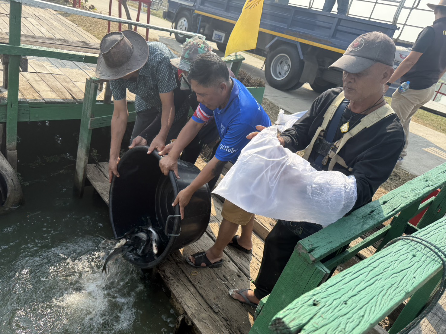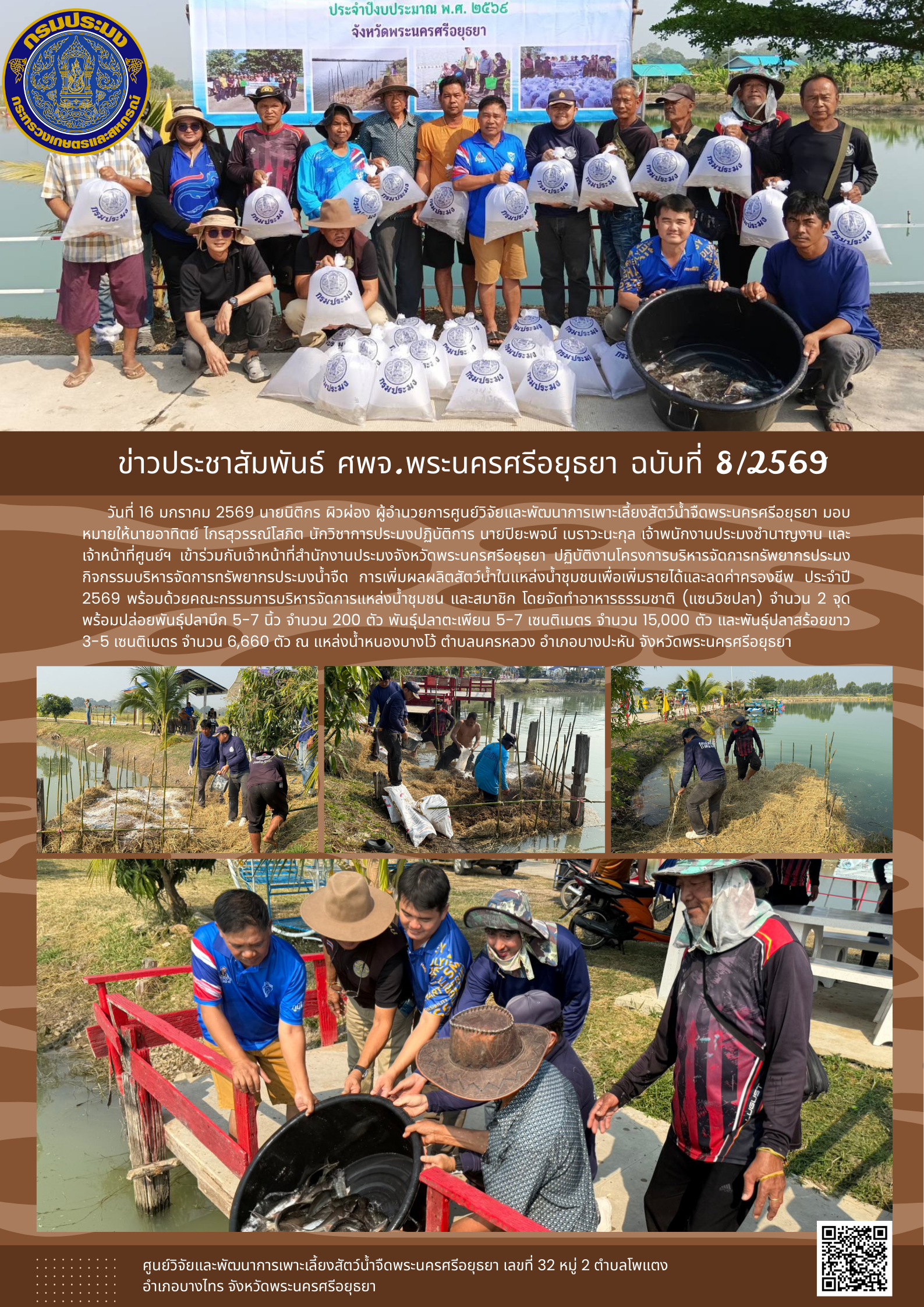 วันที่ 16 มกราคม 2569 นายนิติกร ผิวผ่อง ผู้อำนวยการศูนย์วิจัยและพัฒนาการเพาะเลี้ยงสัตว์น้ำจืดพระนครศรีอยุธยา มอบหมายให้นายอาทิตย์ ไกรสุวรรณ์โสภิต นักวิชาการประมงปฏิบัติการ นายปิยะพจน์ เบราวะนะกุล เจ้าพนักงานประมงชำนาญงาน และ เจ้าหน้าที่ศูนย์ฯ เข้าร่วมกับเจ้าหน้าที่สำนักงานประมงจังหวัดพระนครศรีอยุธยา ปฏิบัติงานโครงการบริหารจัดการทรัพยากรประมง กิจกรรมบริหารจัดการทรัพยากรประมงน้ำจืด การเพิ่มผลผลิตสัตว์น้ำในแหล่งน้ำชุมชนเพื่อเพิ่มรายได้และลดค่าครองชีพ ประจำปี 2569 พร้อมด้วยคณะกรรมการบริหารจัดการแหล่งน้ำชุมชน และสมาชิก โดยจัดทำอาหารธรรมชาติ (แซนวิชปลา) จำนวน 2 จุด พร้อมปล่อยพันธุ์ปลาบึก 5-7 นิ้ว จำนวน 200 ตัว พันธุ์ปลาตะเพียน 5-7 เซนติเมตร จำนวน 15,000 ตัว และพันธุ์ปลาสร้อยขาว 3-5 เซนติเมตร จำนวน 6,660 ตัว ณ แหล่งน้ำหนองบางโว้ ตำบลนครหลวง อำเภอบางปะหัน จังหวัดพระนครศรีอยุธยา