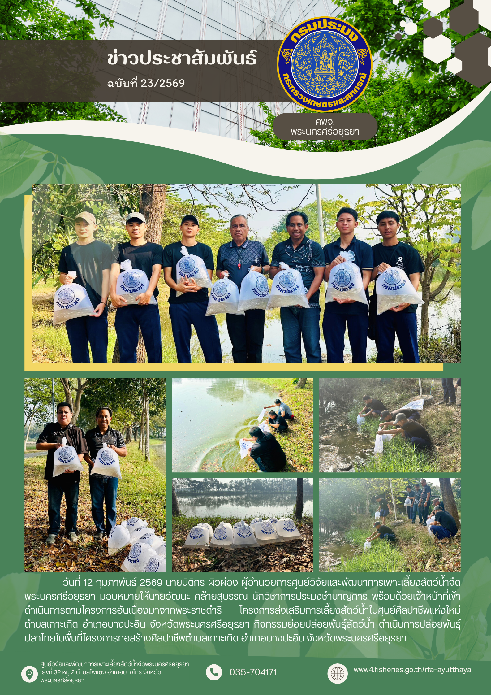 วันที่ 12 กุมภาพันธ์ 2569 นายนิติกร ผิวผ่อง ผู้อำนวยการศูนย์วิจัยและพัฒนาการเพาะเลี้ยงสัตว์น้ำจืดพระนครศรีอยุธยา มอบหมายให้นายวัฒนะ คล้ายสุบรรณ นักวิชาการประมงชำนาญการ พร้อมด้วยเจ้าหน้าที่เข้าดำเนินการตามโครงการอันเนื่องมาจากพระราชดำริ โครงการส่งเสริมการเลี้ยงสัตว์น้ำในศูนย์ศิลปาชีพแห่งใหม่ ตำบลเกาะเกิด อำเภอบางปะอิน จังหวัดพระนครศรีอยุธยา กิจกรรมย่อยปล่อยพันธุ์สัตว์น้ำ ดำเนินการปล่อยพันธุ์ปลาไทยในพื้นที่โครงการก่อสร้างศิลปาชีพตำบลเกาะเกิด อำเภอบางปะอิน จังหวัดพระนครศรีอยุธยา