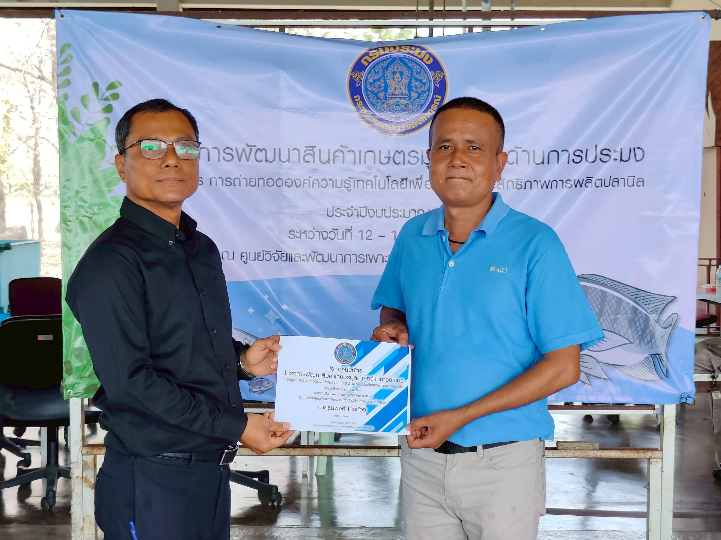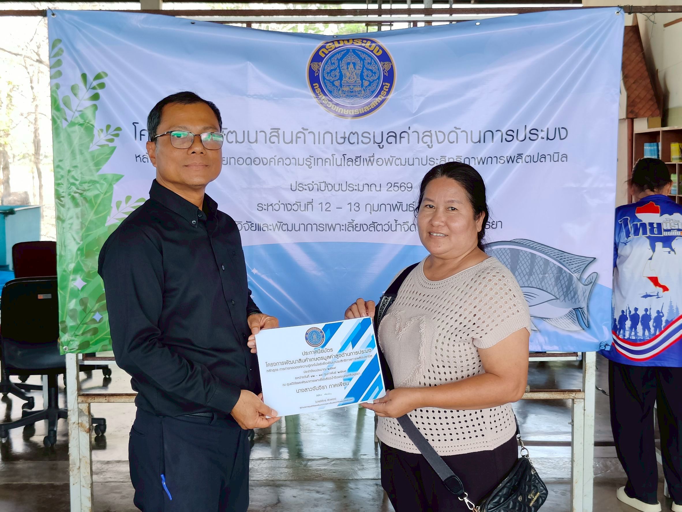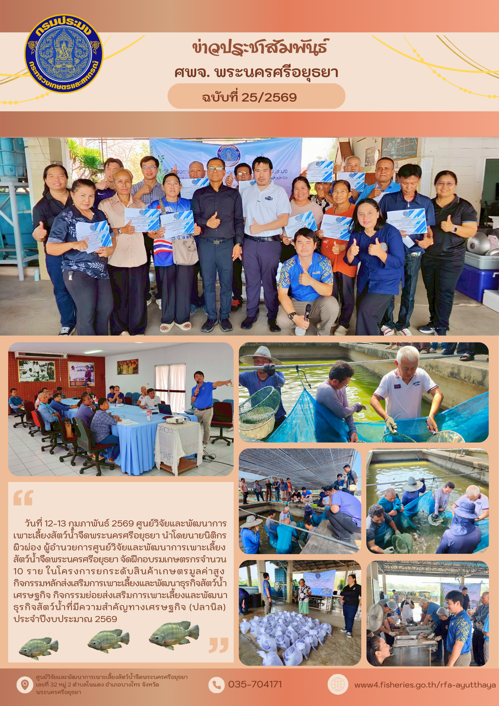 วันที่ 12-13 กุมภาพันธ์ 2569 ศูนย์วิจัยและพัฒนาการเพาะเลี้ยงสัตว์น้ำจืดพระนครศรีอยุธยา นำโดย นายนิติกร ผิวผ่อง ผู้อำนวยการศูนย์วิจัยและพัฒนาการเพาะเลี้ยงสัตว์น้ำจืดพระนครศรีอยุธยา จัดฝึกอบรมเกษตรกร จำนวน10 ราย ในโครงการยกระดับสินค้าเกษตรมูลค่าสูง กิจกรรมหลักส่งเสริมการเพาะเลี้ยงและพัฒนาธุรกิจสัตว์น้ำเศรษฐกิจ กิจกรรมย่อยส่งเสริมการเพาะเลี้ยงและพัฒนาธุรกิจสัตว์น้ำที่มีความสำคัญทางเศรษฐกิจ (ปลานิล)ประจำปีงบประมาณ 2569