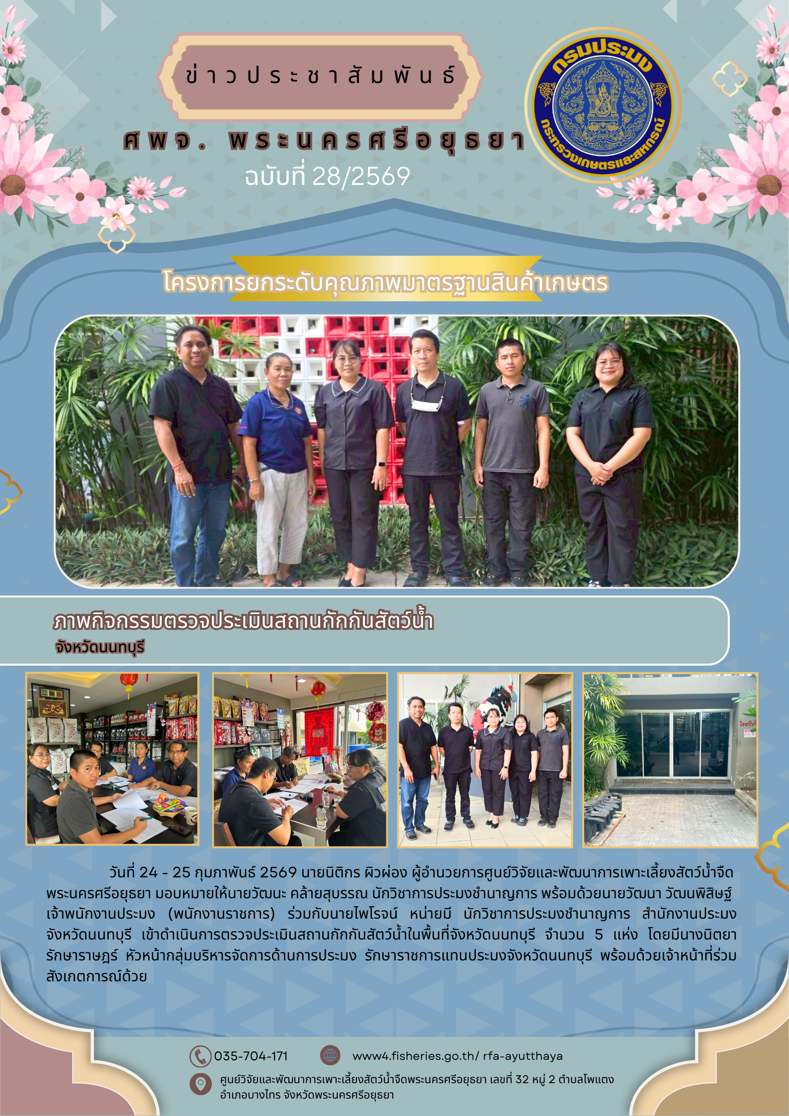 วันที่ 24 - 25 กุมภาพันธ์ 2569 นายนิติกร ผิวผ่อง ผู้อำนวยการศูนย์วิจัยและพัฒนาการเพาะเลี้ยงสัตว์น้ำจืดพระนครศรีอยุธยา มอบหมายให้นายวัฒนะ คล้ายสุบรรณ นักวิชาการประมงชำนาญการ พร้อมด้วยนายวัฒนา วัฒนพิสิษฐ์ เจ้าพนักงานประมง (พนักงานราชการ) ร่วมกับนายไพโรจน์ หน่ายมี นักวิชาการประมงชำนาญการ สำนักงานประมงจังหวัดนนทบุรี เข้าดำเนินการตรวจประเมินสถานกักกันสัตว์น้ำในพื้นที่จังหวัดนนทบุรี จำนวน 5 แห่ง โดยมีนางนิตยา รักษาราษฎร์ หัวหน้ากลุ่มบริหารจัดการด้านการประมง รักษาราชการแทนประมงจังหวัดนนทบุรี พร้อมด้วยเจ้าหน้าที่ร่วมสังเกตการณ์ด้วย