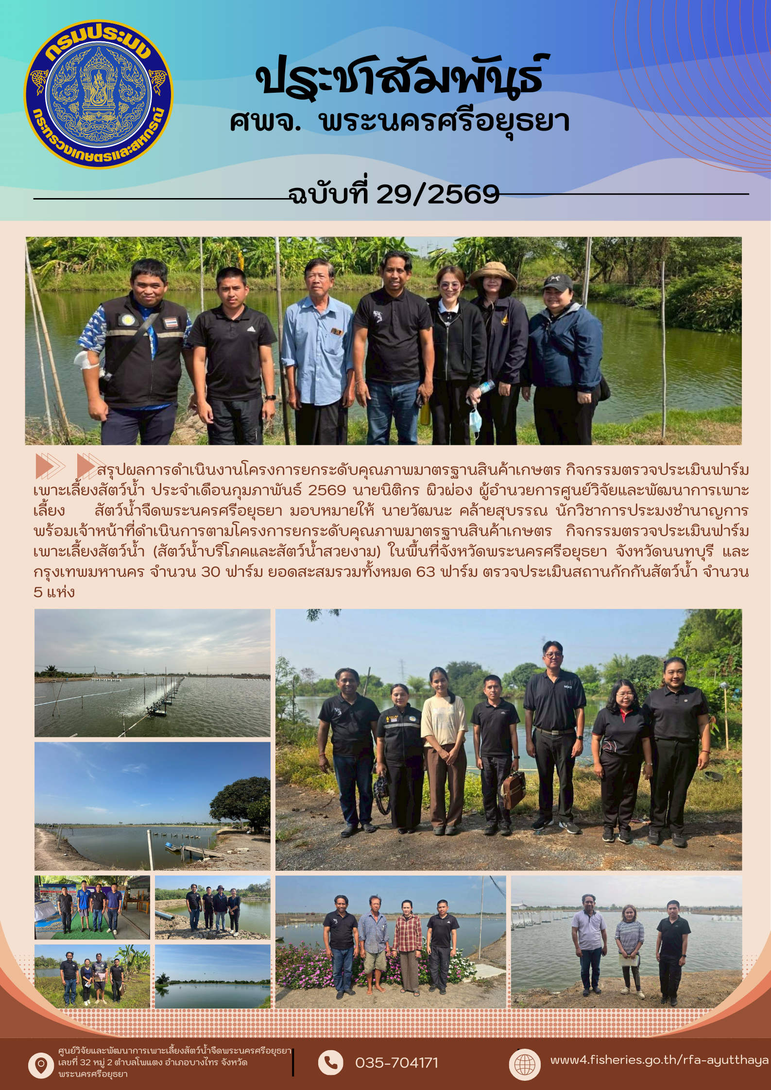 สรุปผลการดำเนินงานโครงการยกระดับคุณภาพมาตรฐานสินค้าเกษตร กิจกรรมตรวจประเมินฟาร์ม เพาะเลี้ยงสัตว์น้ำ ประจำเดือนกุมภาพันธ์ 2569 นายนิติกร ผิวผ่อง ผู้อำนวยการศูนย์วิจัยและพัฒนาการเพาะเลี้ยง สัตว์น้ำจืดพระนครศรีอยุธยา มอบหมายให้ นายวัฒนะ คล้ายสุบรรณ นักวิชาการประมงชำนาญการ พร้อมเจ้าหน้าที่ดำเนินการตามโครงการยกระดับคุณภาพมาตรฐานสินค้าเกษตร กิจกรรมตรวจประเมินฟาร์มเพาะเลี้ยงสัตว์น้ำ (สัตว์น้ำบริโภคและสัตว์น้ำสวยงาม) ในพื้นที่จังหวัดพระนครศรีอยุธยา จังหวัดนนทบุรี และกรุงเทพมหานคร จำนวน 30 ฟาร์ม ยอดสะสมรวมทั้งหมด 63 ฟาร์ม ตรวจประเมินสถานกักกันสัตว์น้ำ จำนวน 5 แห่ง