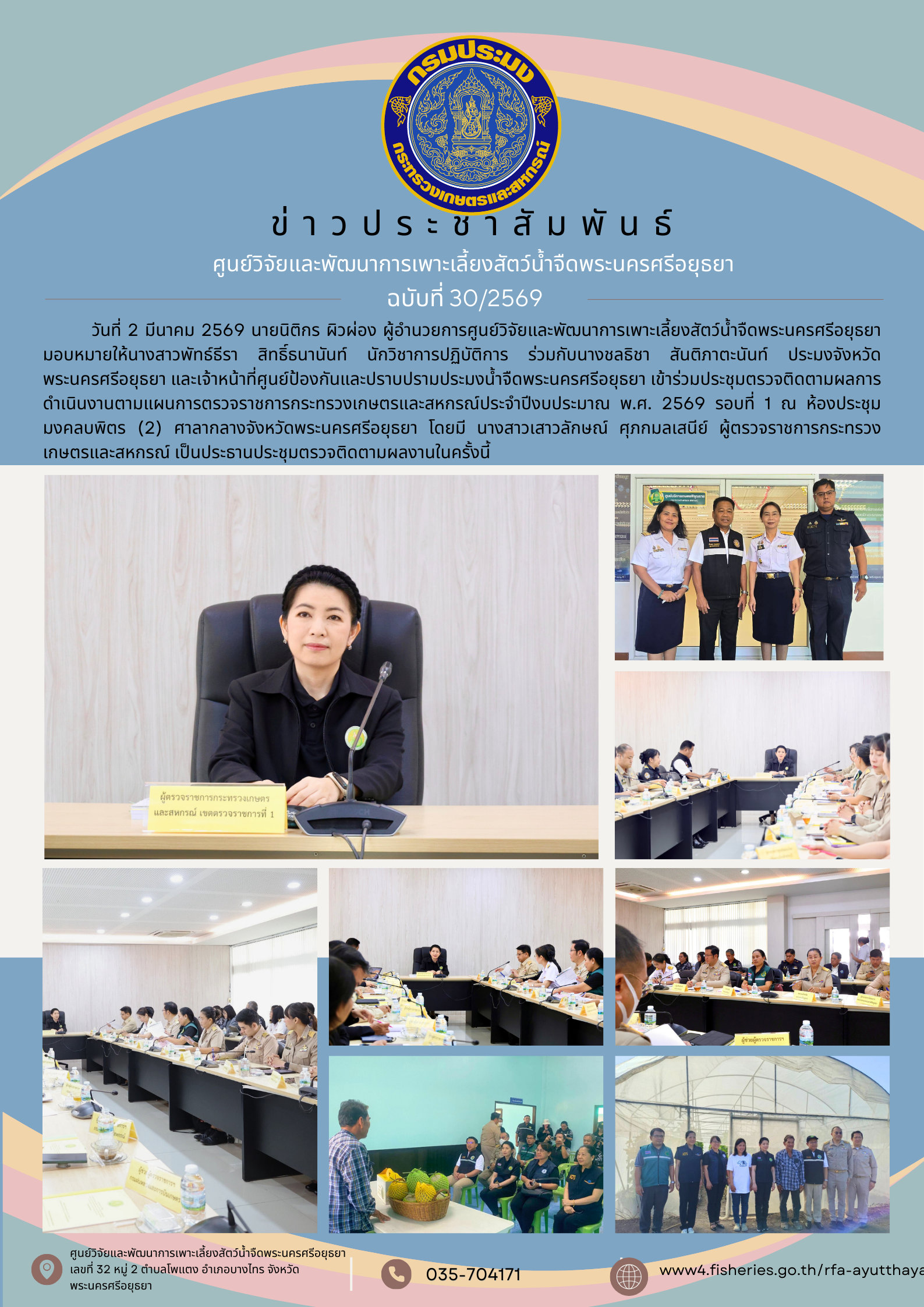 วันที่ 2 มีนาคม 2569 นายนิติกร ผิวผ่อง ผู้อำนวยการศูนย์วิจัยและพัฒนาการเพาะเลี้ยงสัตว์น้ำจืดพระนครศรีอยุธยา มอบหมายให้นางสาวพัทธ์ธีรา สิทธิ์ธนานันท์ นักวิชาการปฏิบัติการ ร่วมกับนางชลธิชา สันติภาตะนันท์ ประมงจังหวัดพระนครศรีอยุธยา และเจ้าหน้าที่ศูนย์ป้องกันและปราบปรามประมงน้ำจืดพระนครศรีอยุธยา เข้าร่วมประชุมตรวจติดตามผลการดำเนินงานตามแผนการตรวจราชการกระทรวงเกษตรและสหกรณ์ประจำปีงบประมาณ พ.ศ. 2569 รอบที่ 1 ณ ห้องประชุมมงคลบพิตร (2) ศาลากลางจังหวัดพระนครศรีอยุธยา โดยมี นางสาวเสาวลักษณ์ ศุภกมลเสนีย์ ผู้ตรวจราชการกระทรวงเกษตรและสหกรณ์ เป็นประธานประชุมตรวจติดตามผลงานในครั้งนี้