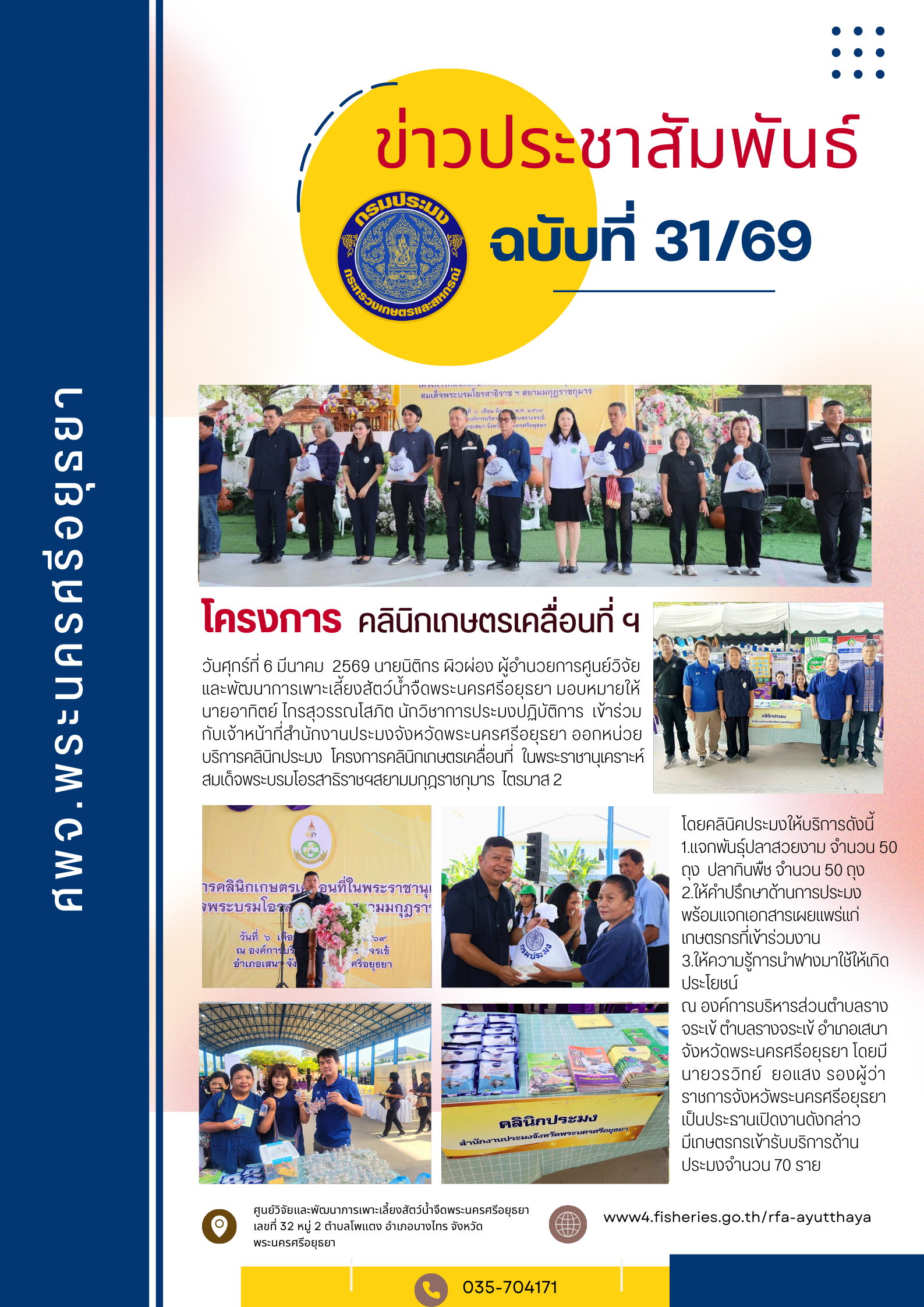 วันศุกร์ที่ 6 มีนาคม 2569 นายนิติกร ผิวผ่อง ผู้อำนวยการศูนย์วิจัยและพัฒนาการเพาะเลี้ยงสัตว์น้ำจืดพระนครศรีอยุธยา มอบหมายให้นายอาทิตย์ ไกรสุวรรณโสภิต นักวิชาการประมงปฏิบัติการ เข้าร่วมกับเจ้าหน้าที่สำนักงานประมงจังหวัดพระนครศรีอยุธยา ออกหน่วยบริการคลินิกประมง โครงการคลินิกเกษตรเคลื่อนที่ ในพระราชานุเคราะห์ สมเด็จพระบรมโอรสาธิราชฯสยามมกุฎราชกุมาร ไตรมาส 2 โดยคลินิคประมงให้บริการดังนี้ 1.แจกพันธุ์ปลาสวยงาม จำนวน 50 ถุง ปลากินพืช จำนวน 50 ถุง 2.ให้คำปรึกษาด้านการประมง พร้อมแจกเอกสารเผยแพร่แก่เกษตรกรที่เข้าร่วมงาน 3.ให้ความรู้การนำฟางมาใช้ให้เกิดประโยชน์ ณ องค์การบริหารส่วนตำบลรางจระเข้ ตำบลรางจระเข้ อำเภอเสนาจังหวัดพระนครศรีอยุธยา โดยมีนายวรวิทย์ ยอแสง รองผู้ว่าราชการจังหวัพระนครศรีอยุธยาเป็นประธานเปิดงานดังกล่าว มีเกษตรกรเข้ารับบริการด้านประมงจำนวน 70 ราย