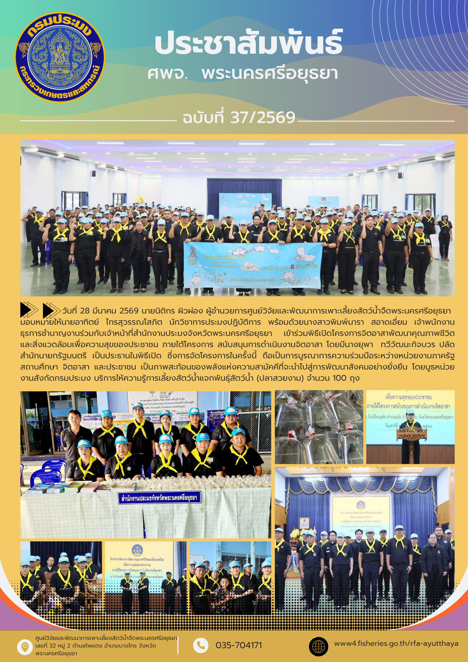 วันที่ 28 มีนาคม 2569 นายนิติกร ผิวผ่อง ผู้อำนวยการศูนย์วิจัยและพัฒนาการเพาะเลี้ยงสัตว์น้ำจืดพระนครศรีอยุธยามอบหมายให้นายอาทิตย์ ไกรสุวรรณโสภิต นักวิชาการประมงปฏิบัติการ พร้อมด้วยนางสาวพิมพ์นารา สอาดเอี่ยม เจ้าพนักงานธุรการชำนาญงานร่วมกับเจ้าหน้าที่สำนักงานประมงจังหวัดพระนครศรีอยุธยา เข้าร่วมพิธีเปิดโครงการจิตอาสาพัฒนาคุณภาพชีวิตและสิ่งแวดล้อมเพื่อความสุขของประชาชน ภายใต้โครงการ สนับสนุนการดำเนินงานจิตอาสา โดยมีนางยุพา ทวีวัฒนะกิจบวร ปลัดสำนักนายกรัฐมนตรี เป็นประธานในพิธีเปิด ซึ่งการจัดโครงการในครั้งนี้ ถือเป็นการบูรณาการความร่วมมือระหว่างหน่วยงานภาครัฐ สถานศึกษา จิตอาสา และประชาชน เป็นภาพสะท้อนของพลังแห่งความสามัคคีที่จะนำไปสู่การพัฒนาสังคมอย่างยั่งยืน โดยบูธหน่วยงานสังกัดกรมประมง บริการให้ความรู้การเลี้ยงสัตว์น้ำแจกพันธุ์สัตว์น้ำ (ปลาสวยงาม) จำนวน 100 ถุง