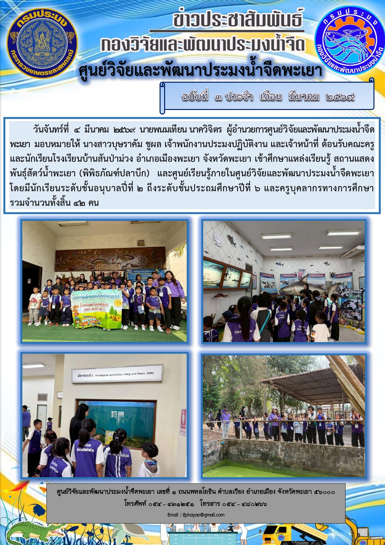 วันจันทร์ที่ 4 มีนาคม 2569 นายพนมเทียน นาควิจิตร ผู้อำนวยการศูนย์วิจัยและพัฒนาประมงน้ำจืดพะเยา มอบหมายให้ นางสาวบุษราคัม ชูผล เจ้าพนักงานประมงปฏิบัติงาน และเจ้าหน้าที่ ต้อนรับคณะครูและนักเรียนโรงเรียนบ้านสันป่าม่วง อำเภอเมืองพะเยา จังหวัดพะเยา เข้าศึกษาแหล่งเรียนรู้ สถานแสดงพันธุ์สัตว์น้ำพะเยา (พิพิธภัณฑ์ปลาบึก) และศูนย์เรียนรู้ภายในศูนย์วิจัยและพัฒนาประมงน้ำจืดพะเยา โดยมีนักเรียนระดับชั้นอนุบาลปี่ที่ 2 ถึงระดับชั้นประถมศึกษาปีที่ 6 และครูบุคลากรทางการศึกษา รวมจำนวนทั้งสิ้น 42 คน