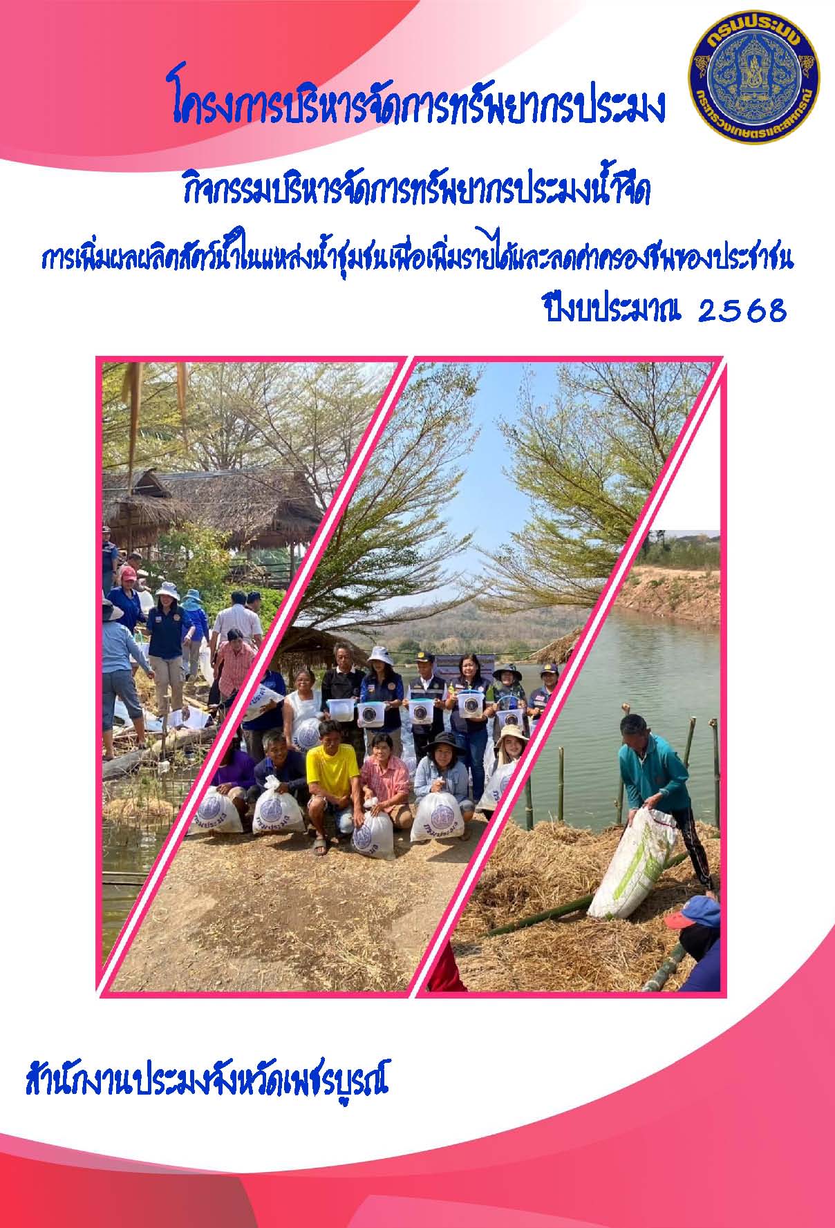 โครงการบริหารจัดการทรัพยากรประมง กิจกรรมบริหารจัดการทรัพยากรประมงน้ำจืด การเพิ่มผลผลิตสัตว์น้ำในแหล่งน้ำชุมชนเพื่อเพิ่มรายได้และลดค่าครองชีพของประชาชน เป็นโครงการตามนโยบายของกระทรวงเกษตรและสหกรณ์ ดำเนินการโดยกรมประมง เพื่อส่งเสริมให้ชุมชนในพื้นที่ของจังหวัดเพชรบูรณ์มีความเข้มแข็ง สามารถบริหารจัดการผลผลิตเกษตรด้านการประมงให้เกิดประสิทธิภาพสูงสุด โดยอาศัยแหล่งน้ำชุมชนเป็นศูนย์กลางในการบริหารจัดการโดยชุมชน การขับเคลื่อนการดำเนินงานโครงการฯ โดยมีคณะกรรมการแหล่งน้ำ ที่ชุมชนคัดเลือก มีเป้าหมายในการเพิ่มผลผลิตสัตว์น้ำในแหล่งน้ำชุมชนให้เป็นแหล่งผลิตอาหารของชุมชน สามารถลดรายจ่ายและสร้างรายได้ในครัวเรือน ซึ่งจะเป็นหลักประกันความมั่นคงทางด้านอาหารให้กับราษฎรในพื้นที่
