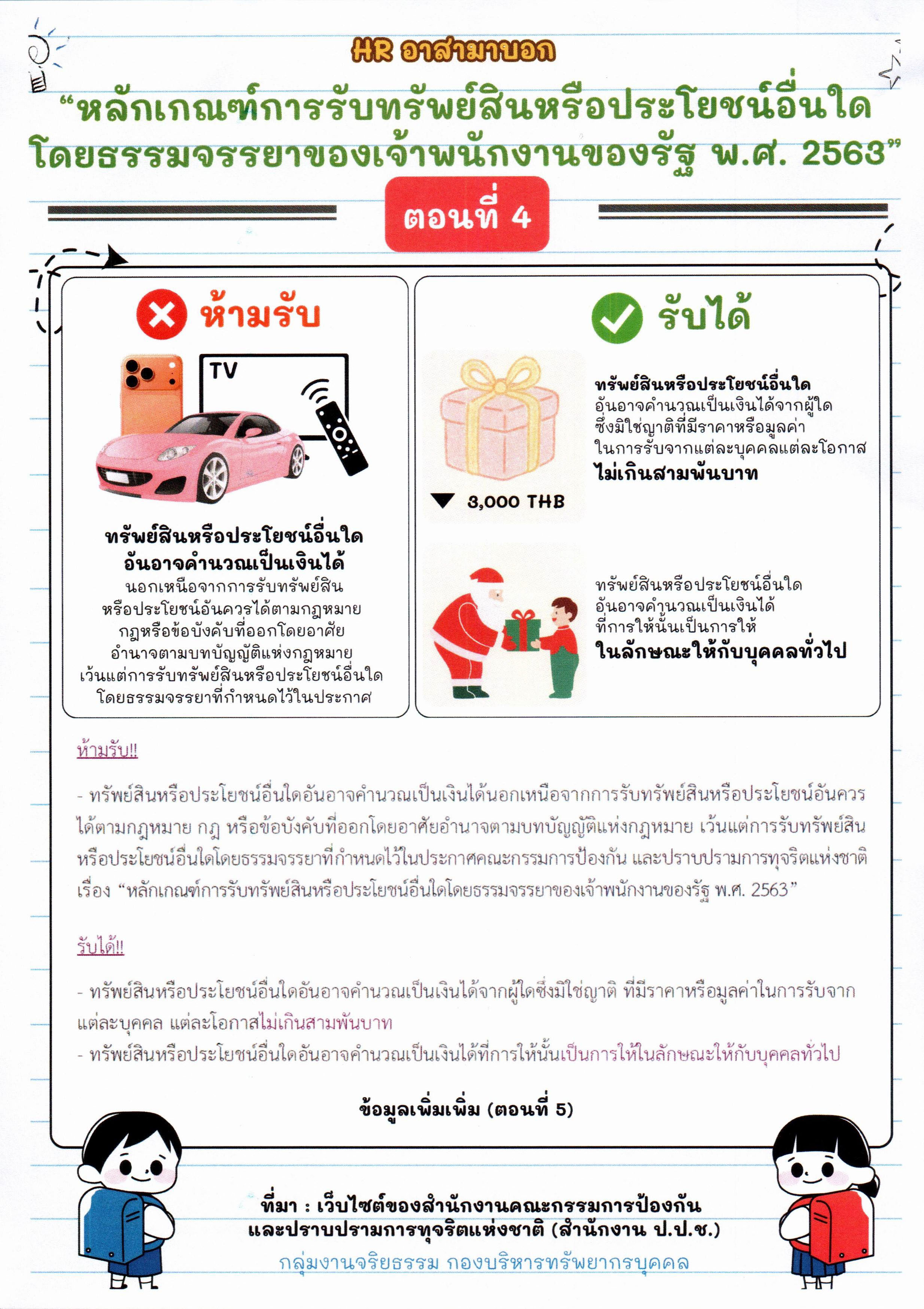 (๔) คิดถึงประโยชน์ส่วนรวมมากกว่าประโยชน์ส่วนตัว ไม่มีผลประโยชน์ทับซ้อน เสียสละ มีจิตสาธารณะ สามารถแยกเรื่องส่วนตัวออกจากหน้าที่การงาน  ไม่กระทำการอันมีลักษณะ เป็นการขัดกันระหว่างประโยชน์ส่วนบุคคลและประโยชน์ส่วนรวม และไม่ประกอบกิจการหรือเข้าไปเกี่ยวข้องกับผลประโยชน์อันเกิดจากการปฏิบัติหน้าที่ของตน